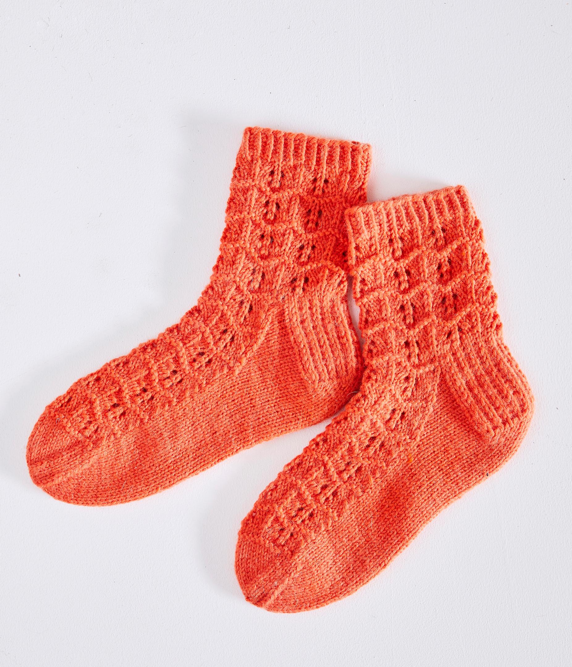 Merja Ojanperän suunnittelemissa helpoissa pitsineulesukissa on kaikki, mitä voit toivoa: nopeasti etenevä malli, kaunis pitsipinta ja herkullisen sähäkkä väri. Voit neuloa sukat myös puuvillalangasta.