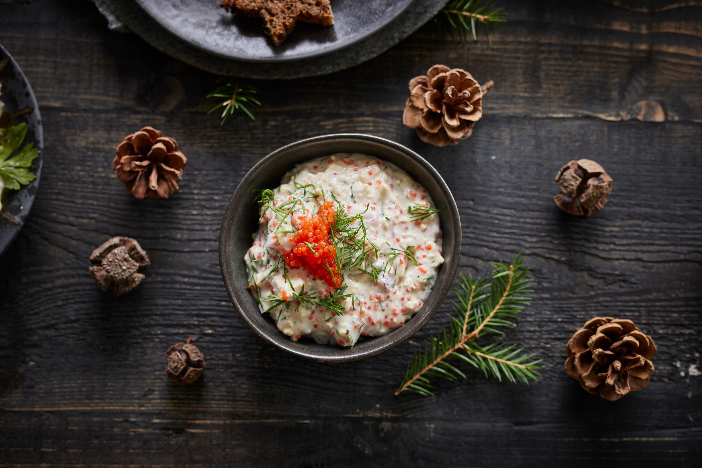 Klassinen katkarapuskagen muuntuu vaivatta vegaaniseksi käyttämällä savutofua ja merileväkaviaaria. Resepti on ihanan simppeli: murennetun tofun joukkoon sekoitetaan hienonnettua punasipulia, kaurafraichea, vegaanista majoneesia, merileväkaviaaria, sitruunaa, tilliä, mustapippuria ja suolaa. Tarjoa tofuskagen joulupöydän alkupalapöydässä esimerkiksi saaristolaisleivän tai keitettyjen perunoiden kanssa.