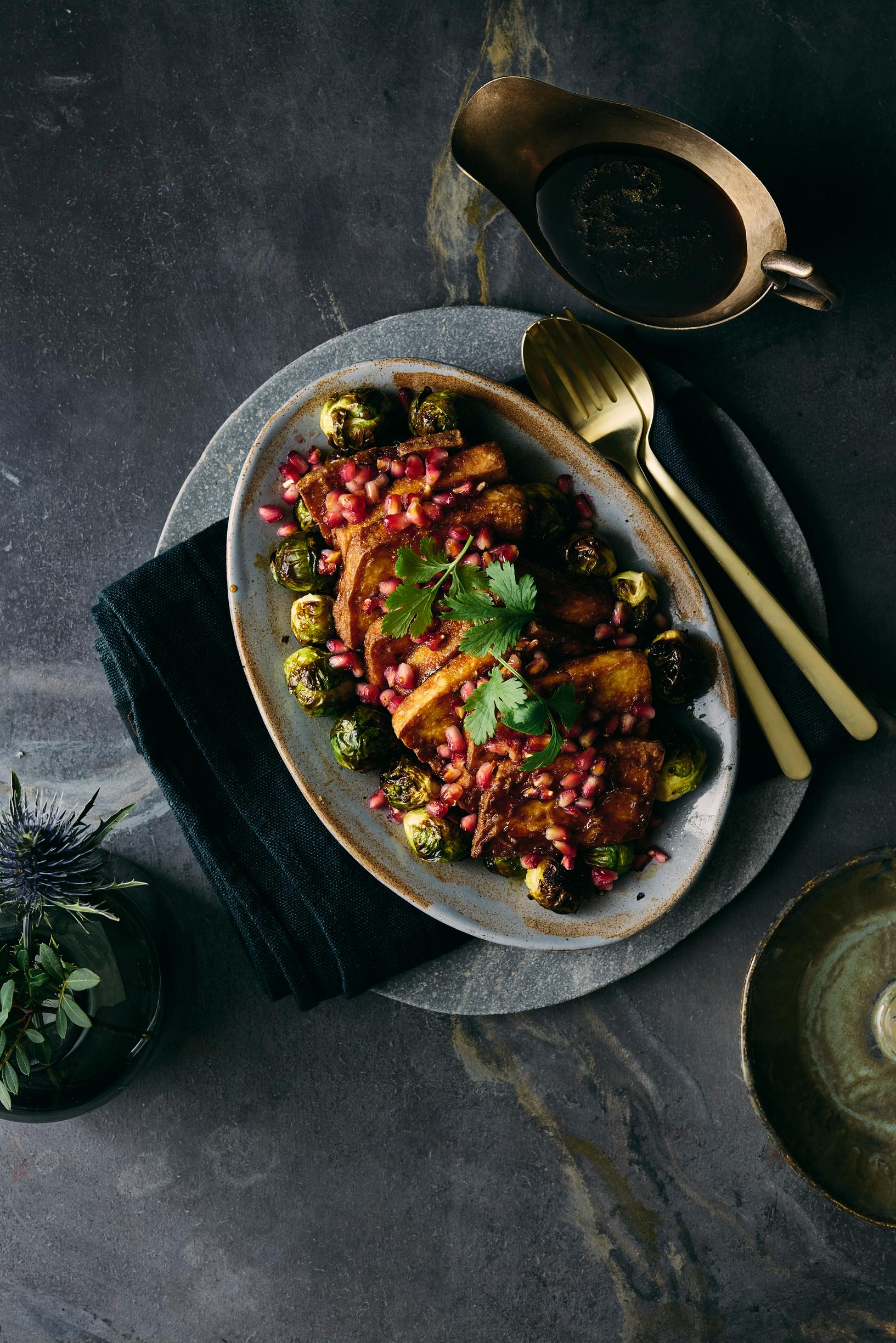 Aasialaisittain maustetusta tofusta valmistuu näppärästi rapeat tofuleikkeet. Mukavan maukas tofu tarjotaan paahdettujen ruusukaalien, granaattiomenan ja hoisinkastikkeen kera. Täydellinen pääruoka, kun kaipaat joulupöytään lisää makua!