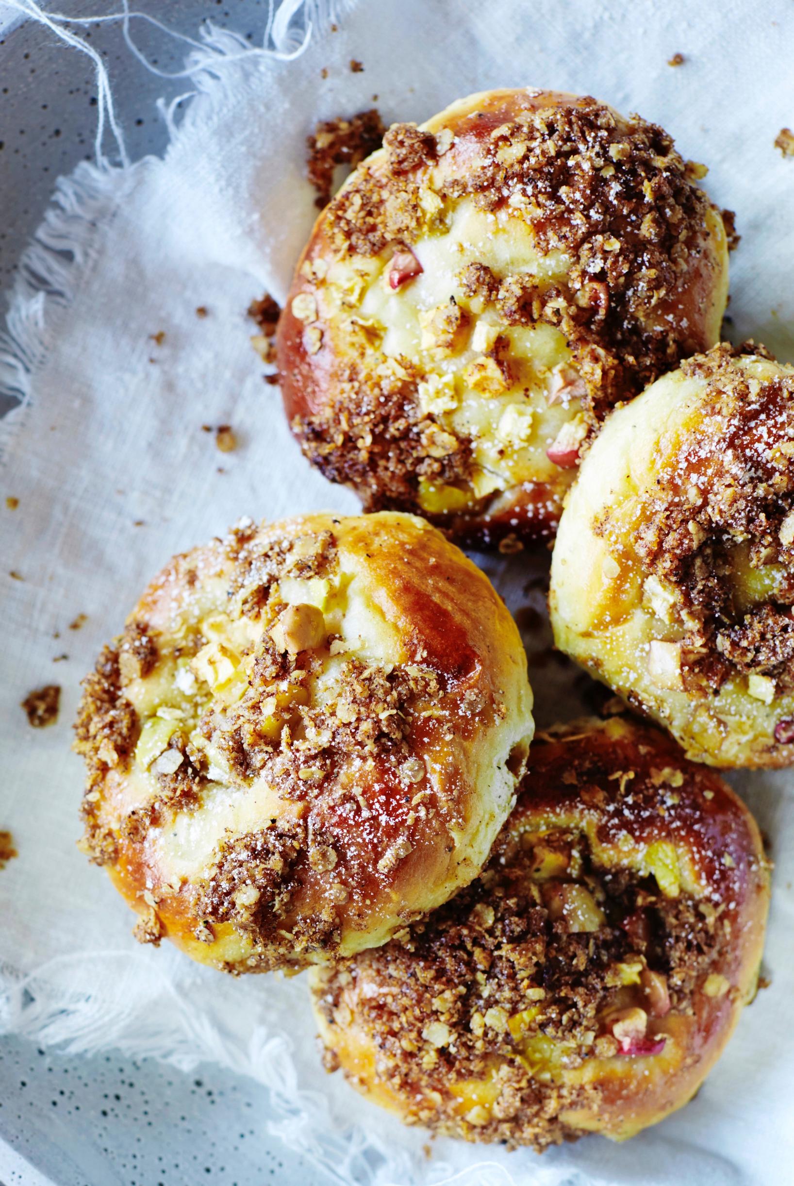 Omena sopii myös pullien täytteeksi. Omena-toscapullat saavat päälleen perinteisen kauratoscan eli voista, fariinisokerista, kaurahiutaleista, kanelista ja kardemummasta sekoitetun murun.