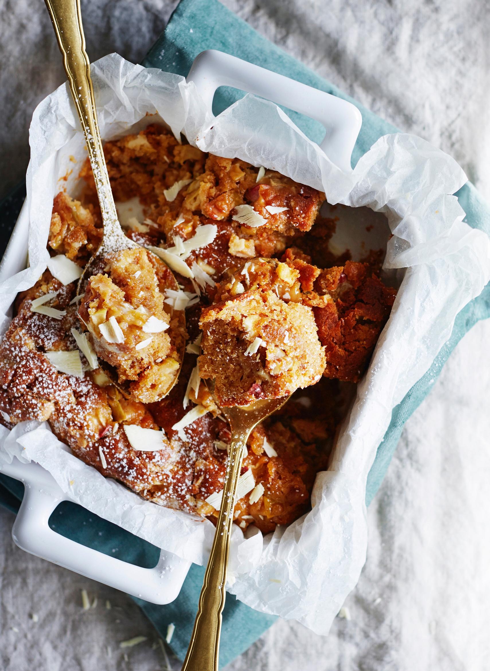 Omena-tiikerikakku muistuttaa perinteistä tiikerikakkua, mutta kaakaolla maustetun taikinan sijaan raita tehdäänkin manteleita, vehnäjauhoja ja sokeria sisältävästä muruseoksesta. Kun kakkutaikinassa on runsaasti raastettua omenaa, lopputulos on taivaallisen mehevä.
