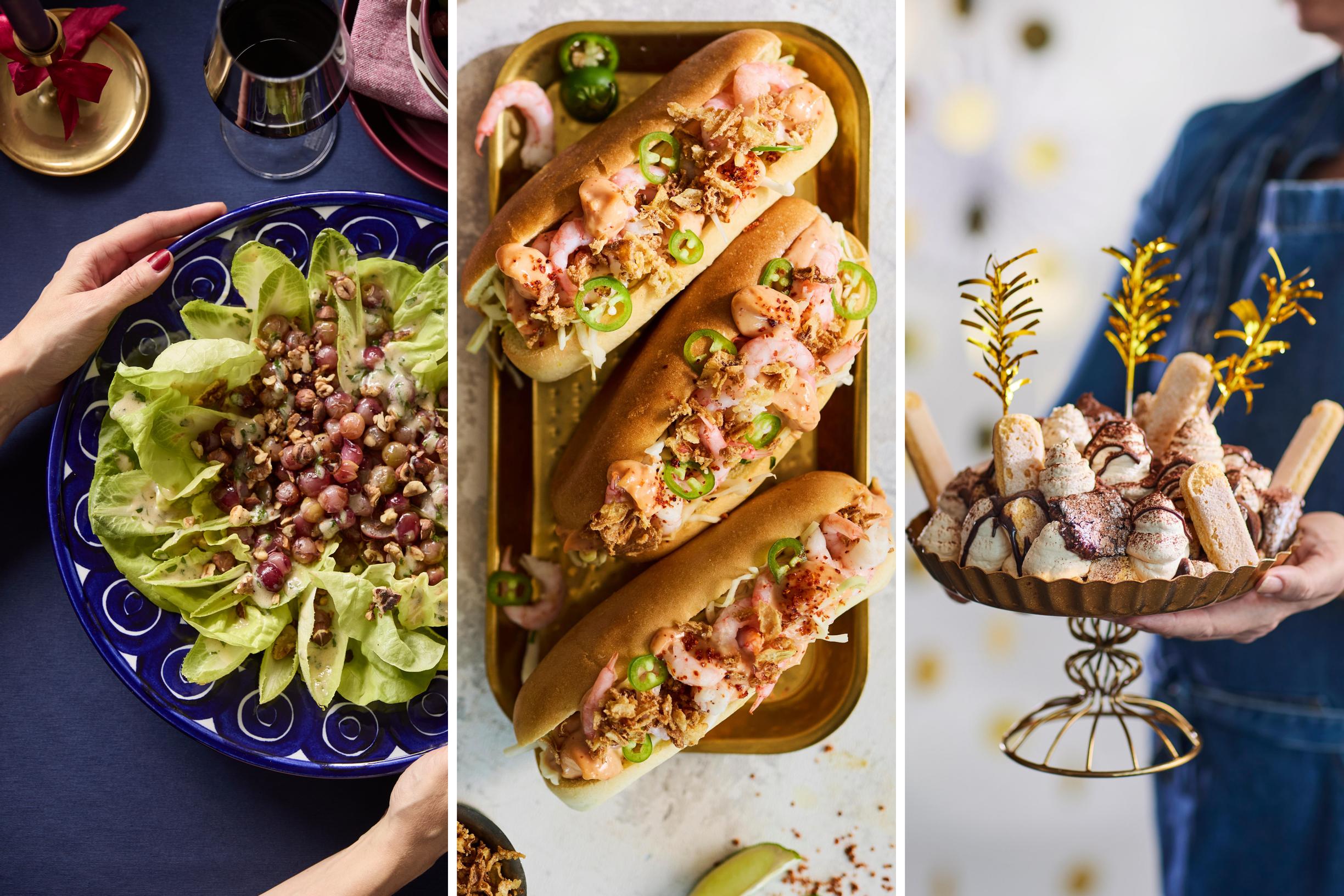 Tämä helppo uudenvuoden menu toimii täydellisesti, kun haluat tarjota näyttävän ja täyttävän aterian, mutta et halua viettää koko iltaa keittiössä. Lämpimään viinirypälesalaattiin tarvitaan vain muutama aines, katkarapuhodarit jokainen saa koota itse ja jälkkäriin upotetaan valmista mutakakkua.
