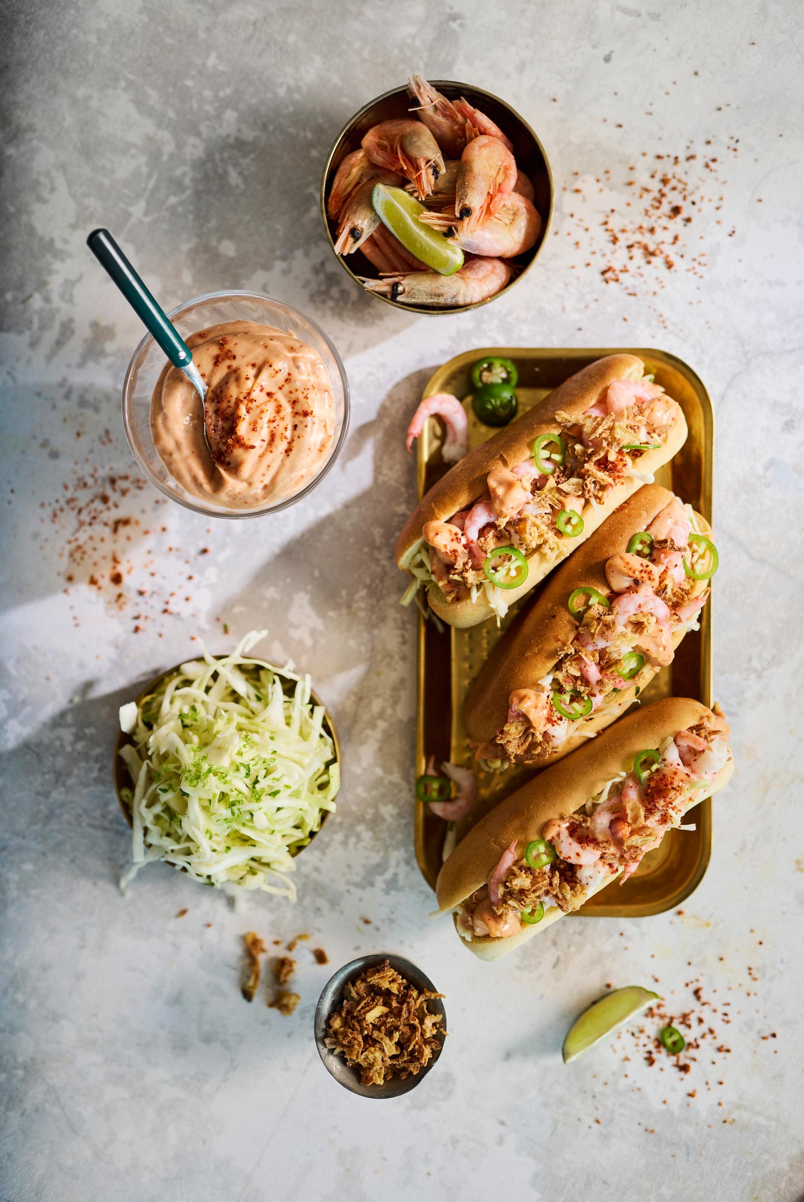 Rapujuhlissa kootaan rapuleipiä, uudenvuodenkemuissa puolestaan katkarapuhodareita! Tee ennakkoon nopeat (mutta trendikkäät) lisukkeet ja sulata kokonaiset katkaravut. Ruokailuhetkeen jää vain hodareiden lämmitys ja täytteiden nostaminen pöytään. Sitten vieraat pääsevätkin hommiin: jokainen saa kuoria katkarapunsa ja koota hodarinsa.