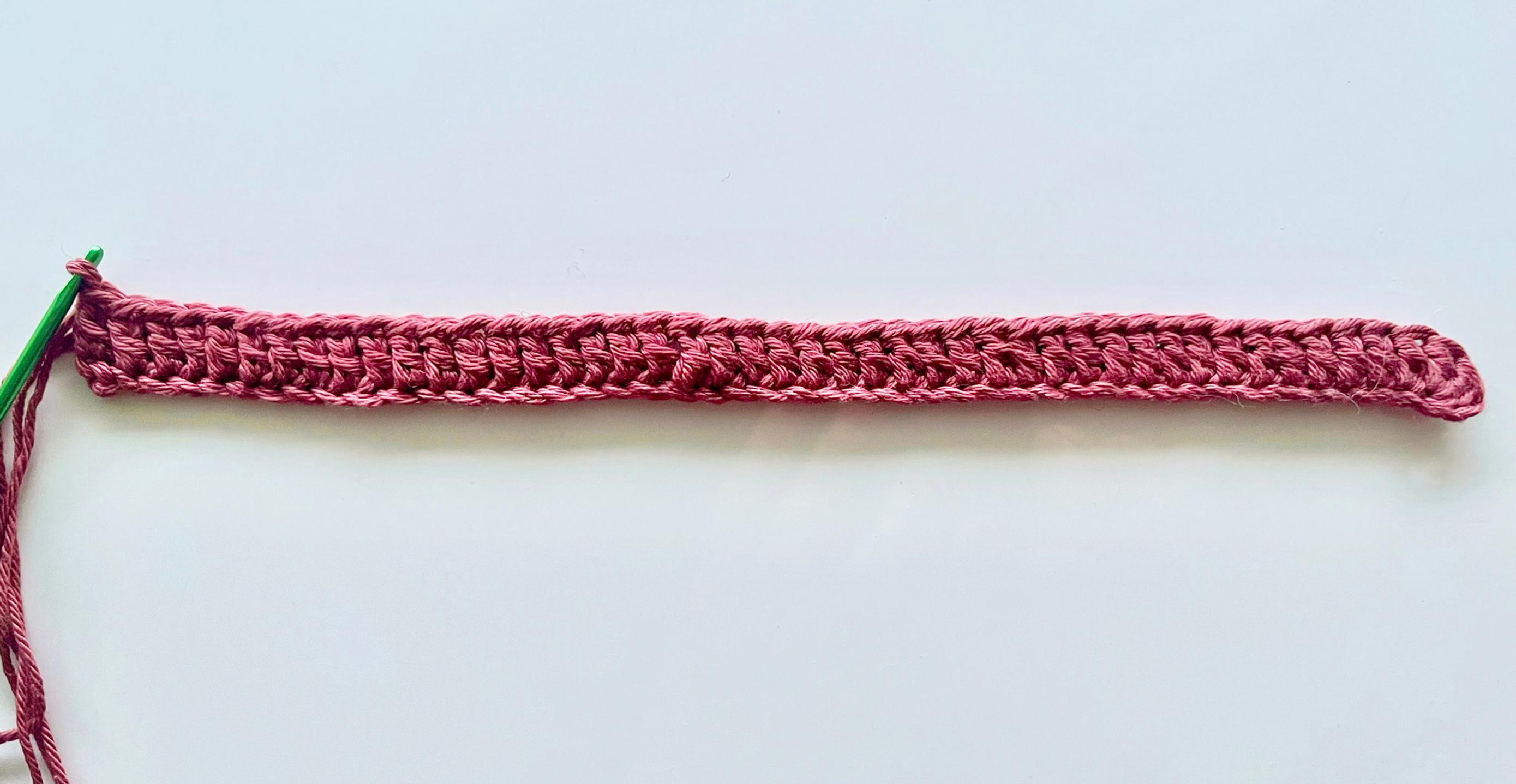 11. Virkkaa 2. pylväskrs ja päättele hihna. Halutessasi voit virkata hihnasta leveämmän, etenkin jos aiot kuljettaa painavampia tavaroita. Tee parillinen määrä kerroksia, jos haluat kiinnittää hihnan laukkuun työstä jääneillä langanpäillä.