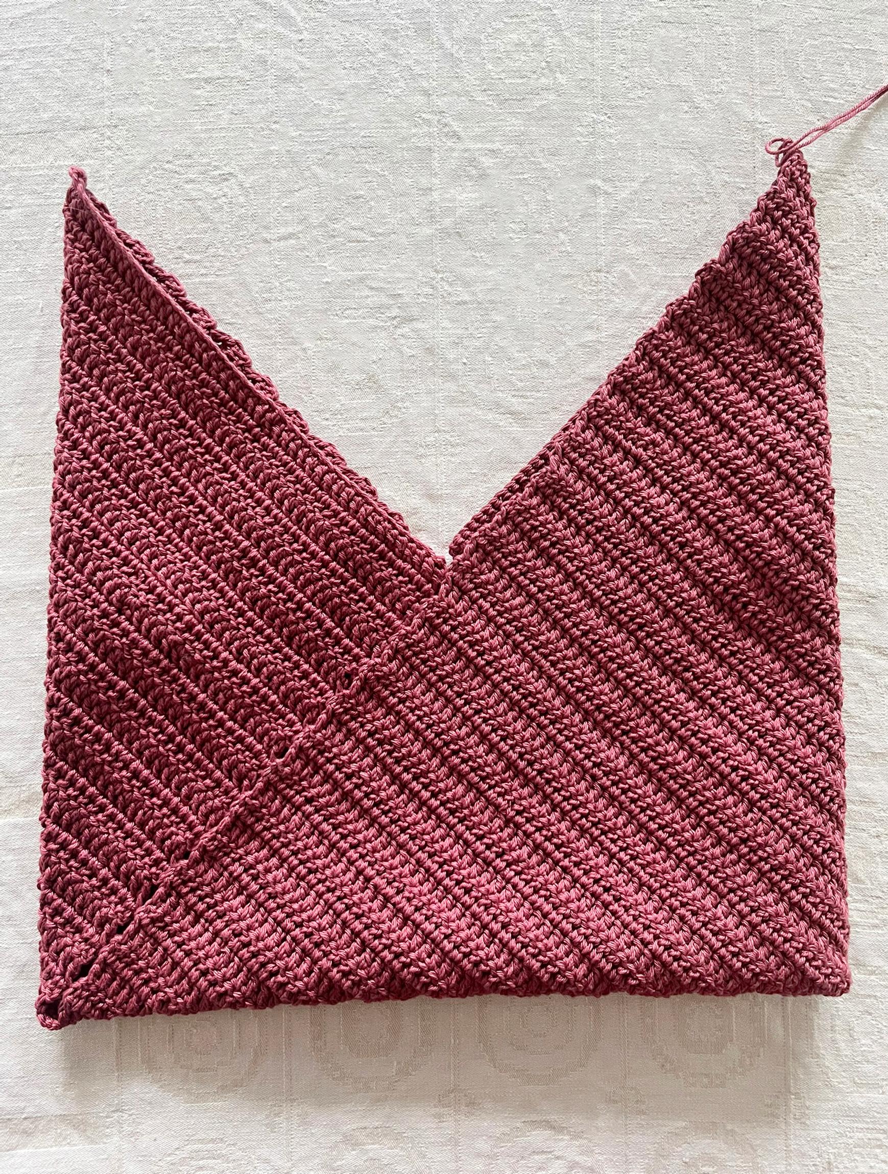 8. Huolittele halutessasi laukun oikeanpuoleinen yläreuna (kts. viiva yllä olevasta kuvasta) kerroksella kiinteitä silmukoita, jos haluat reunasta yhtä tasaisen kuin vasemmalla puolella. Virkkaa kiinteitä silmukoita V:n taitteeseen asti. Tee sama toiselle puolelle laukkua.
