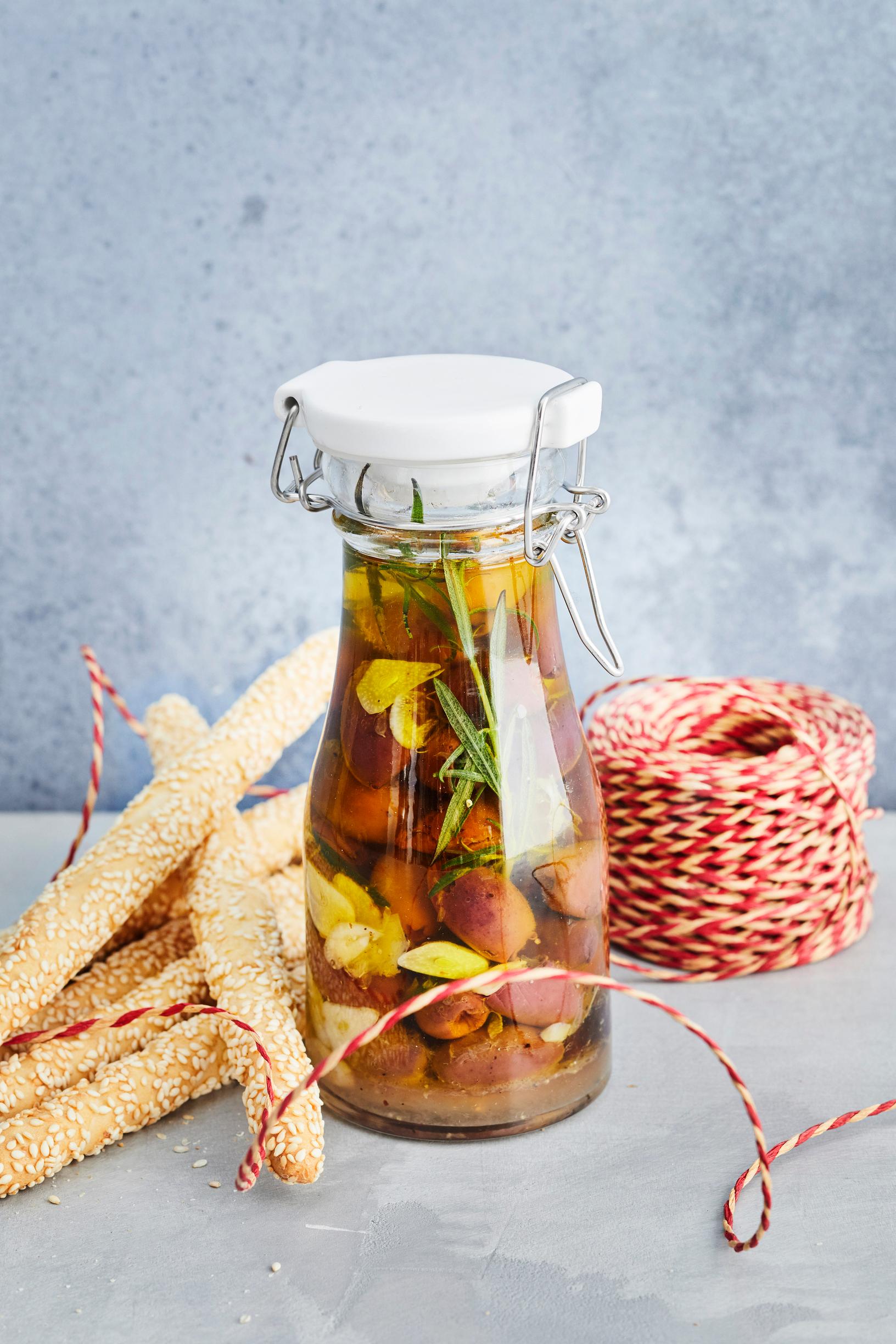 Nopeasti valmistuvat ja taatusti herkulliset rosmariini-valkosipulioliivit käyvät kaikkeen: helppoon naposteluun ja osaksi alkupalapöytää tai pastakastiketta. Koristele paketti vielä muutamalla grissinillä. Ne löydät valmiina kaupasta.