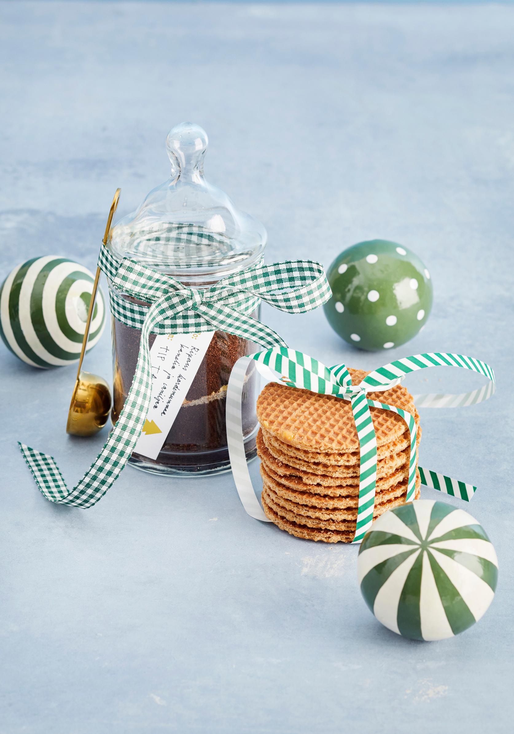 Hemmottele kahvinystävää sekoittamalla lahjakahvin joukkoon lusikallinen kanelia, kardemummaa ja vaniljaa. Pakkaa kahvin kaveriksi pino siirappivohveleita. Niitä löydät valmiina kaupasta.