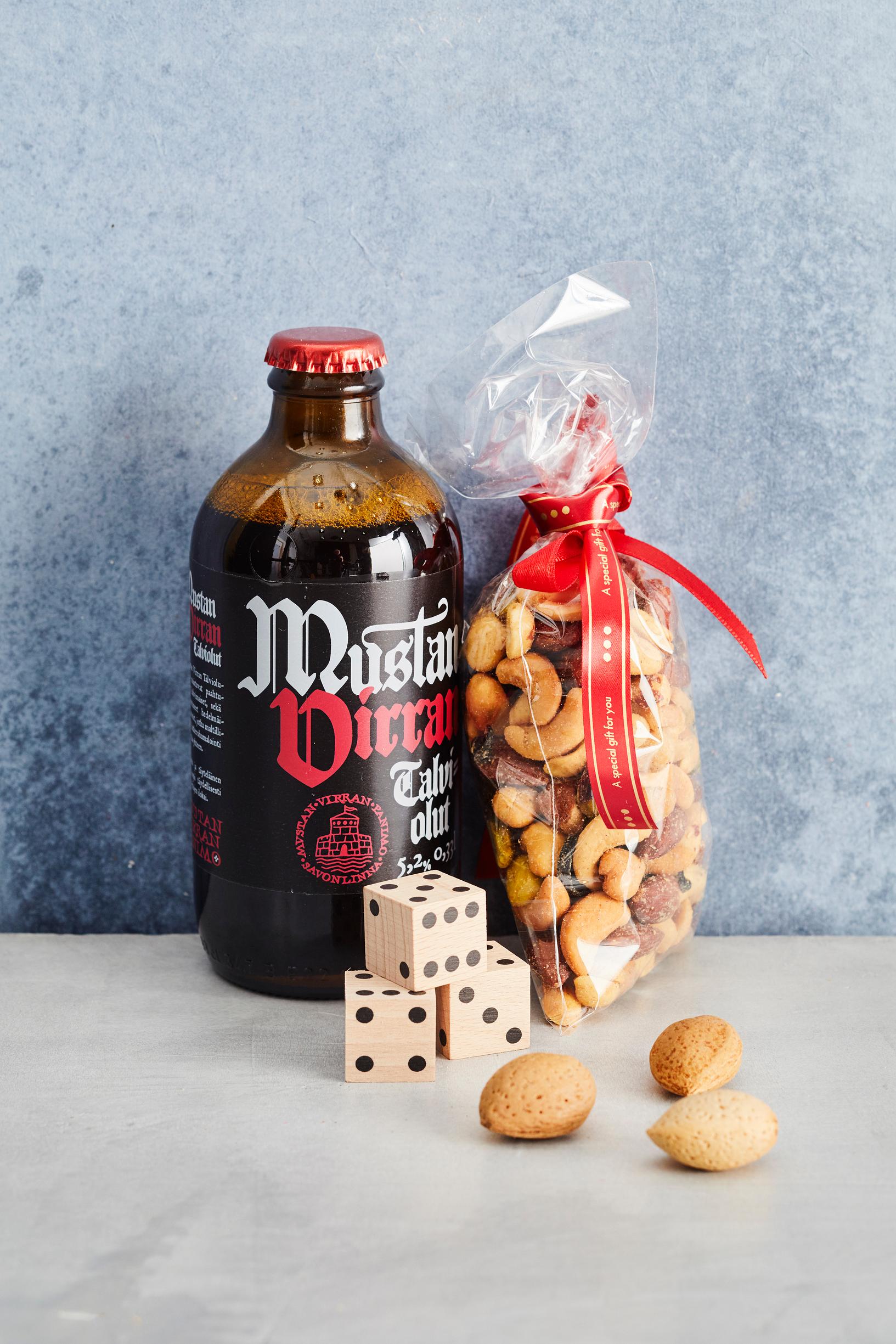 Herkkukoriin voi pakata myös peli-illan parhaat eväät. Tarvitset pienpanimo-olutta ja pussillisen pähkinäsekoitusta ja nopan heitto voi alkaa. Jos kokoat useamman joulukorin, osta iso pussi pähkinöitä ja pakkaa ne kauniisti pienempiin osiin.
