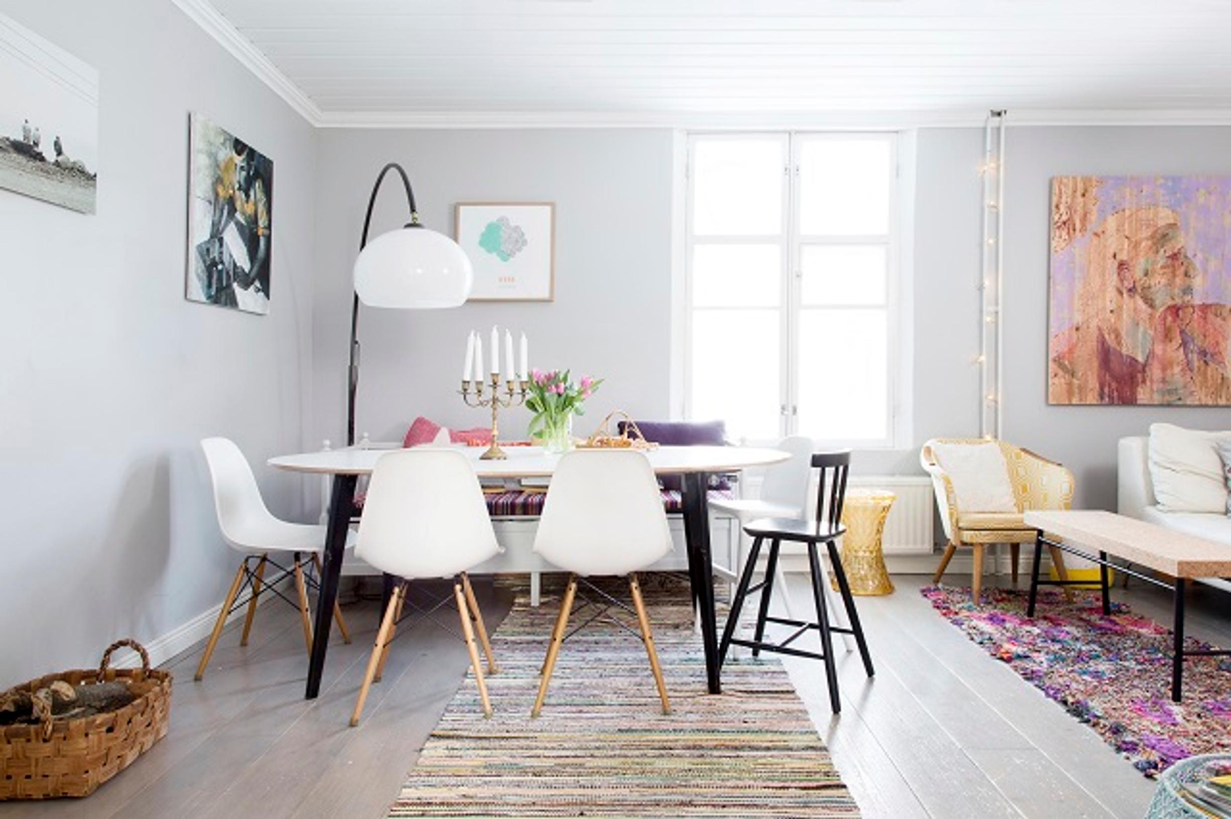 Ruokapöytä ja tuolit ovat lahja. Kaareva lamppu on peräisin perheen äidin lapsuudenkodista. Räsymatto on isän mumman peruja, samoin pöydän takana oleva puusohva poppanoineen. Valokuva Vietnamista on häälahja valokuvaaja Leena Ylä-Lylyltä. Maalaus ”Model” on ristiäislahja Katariina Guthwertilta.