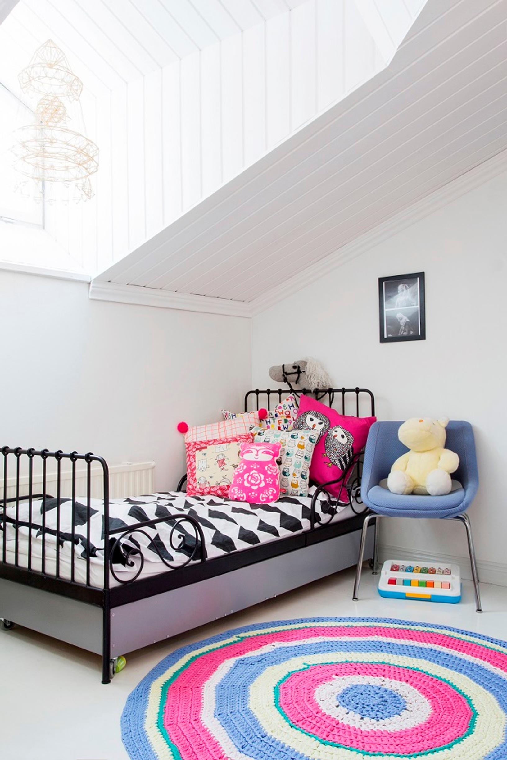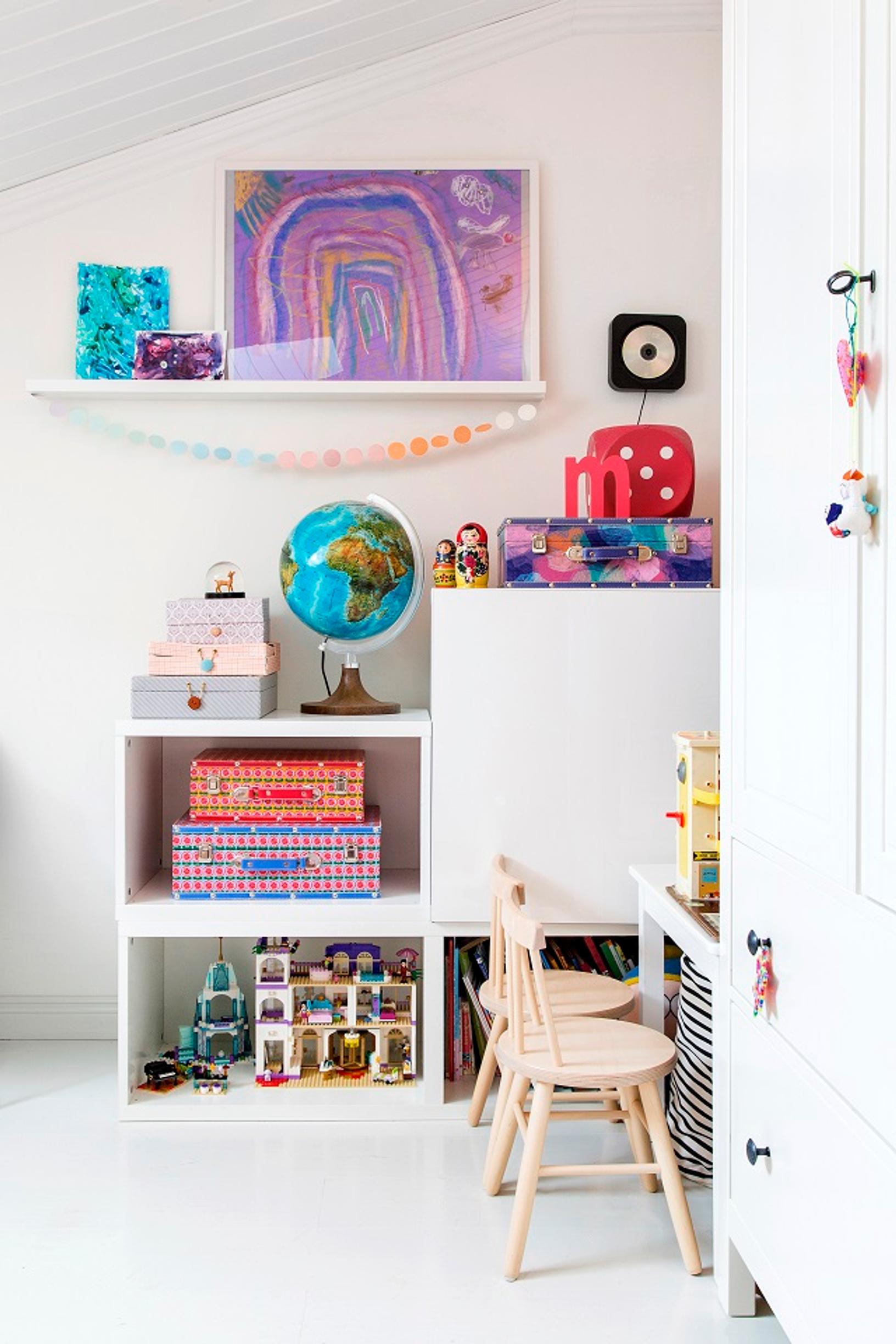 Lastenhuone tulvii iloisia värejä, joita kertyy leluista ja kierrätetyistä huonekaluista. ”Lapset viihtyvät hyvin yhteisessä huoneessaan. Heille on tärkeintä, että lelut löytyvät aina tietyistä laatikoista, johon ne on siivottu. Huoneen tunnelma muuttuu päivittäin leikkien myötä: välillä ollaan laivassa, toisinaan taas metsässä tai merellä.”