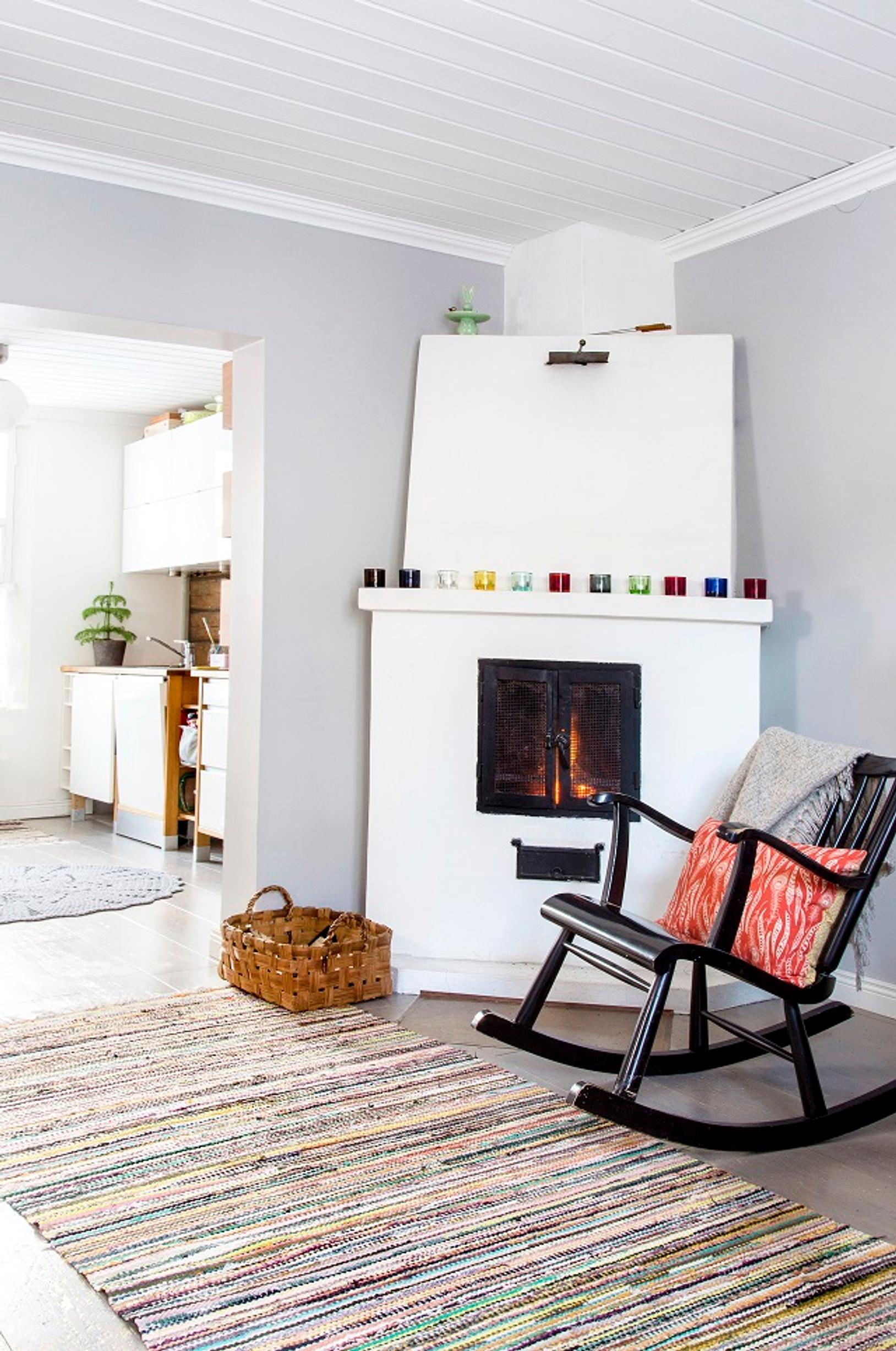 Takasta nautitaan talvella myös viikonloppuaamuisin. ”Kodissamme tärkeää meille on rauhallinen tunnelma, kauniit lautalattiat ja takka. Talvisin päivän touhujen jälkeen vietämme usein rauhallisen teehetken takan ääressä. Sen rätinä rauhoittaa ja tuo mökkifiiliksen”, asukkaat kertovat.