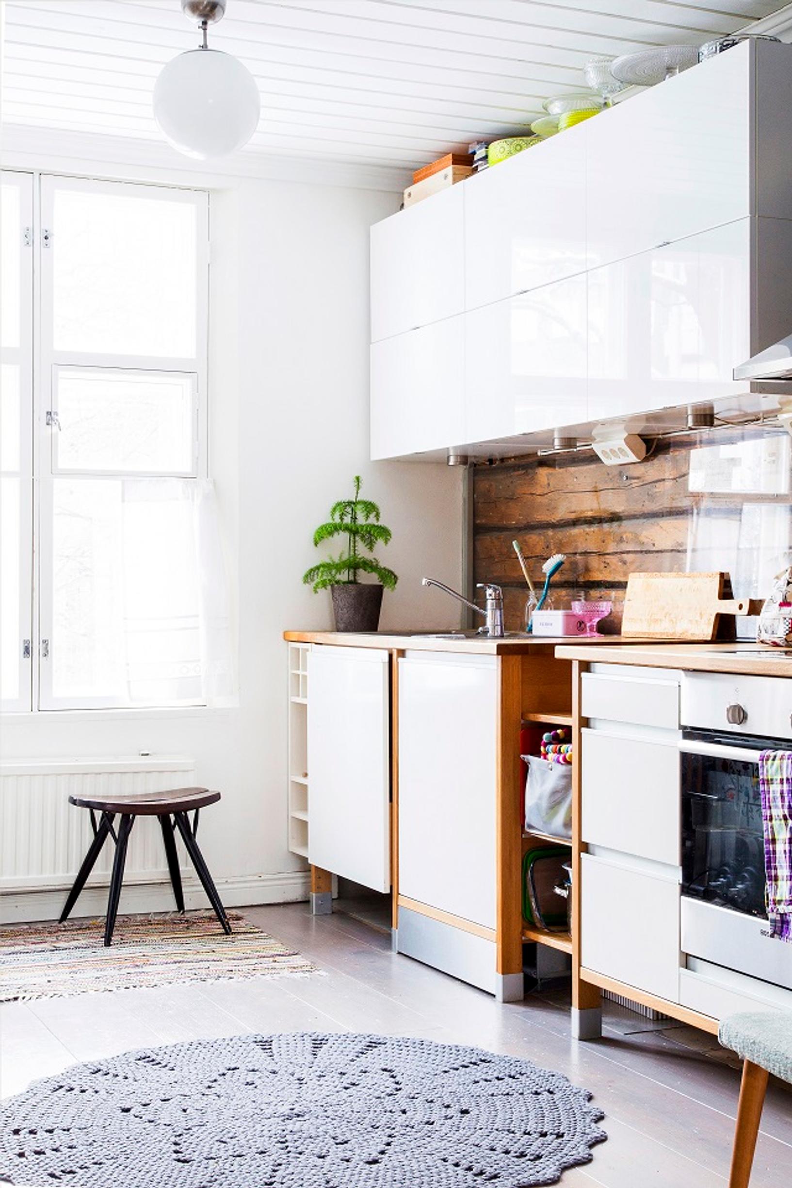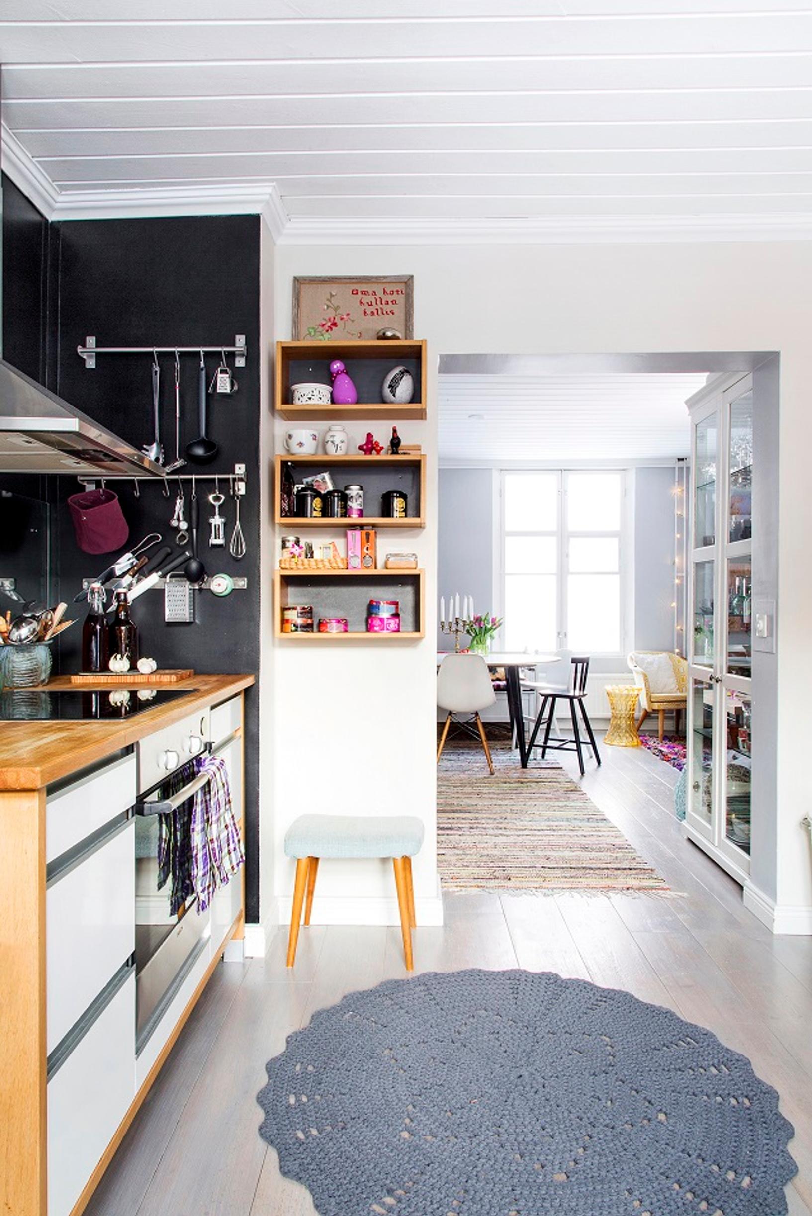Kodikkaassa keittiössä syntyy herkkuja ranskalaisella vivahteella. Pyöreä matto on perheen isän äidin virkkaama.