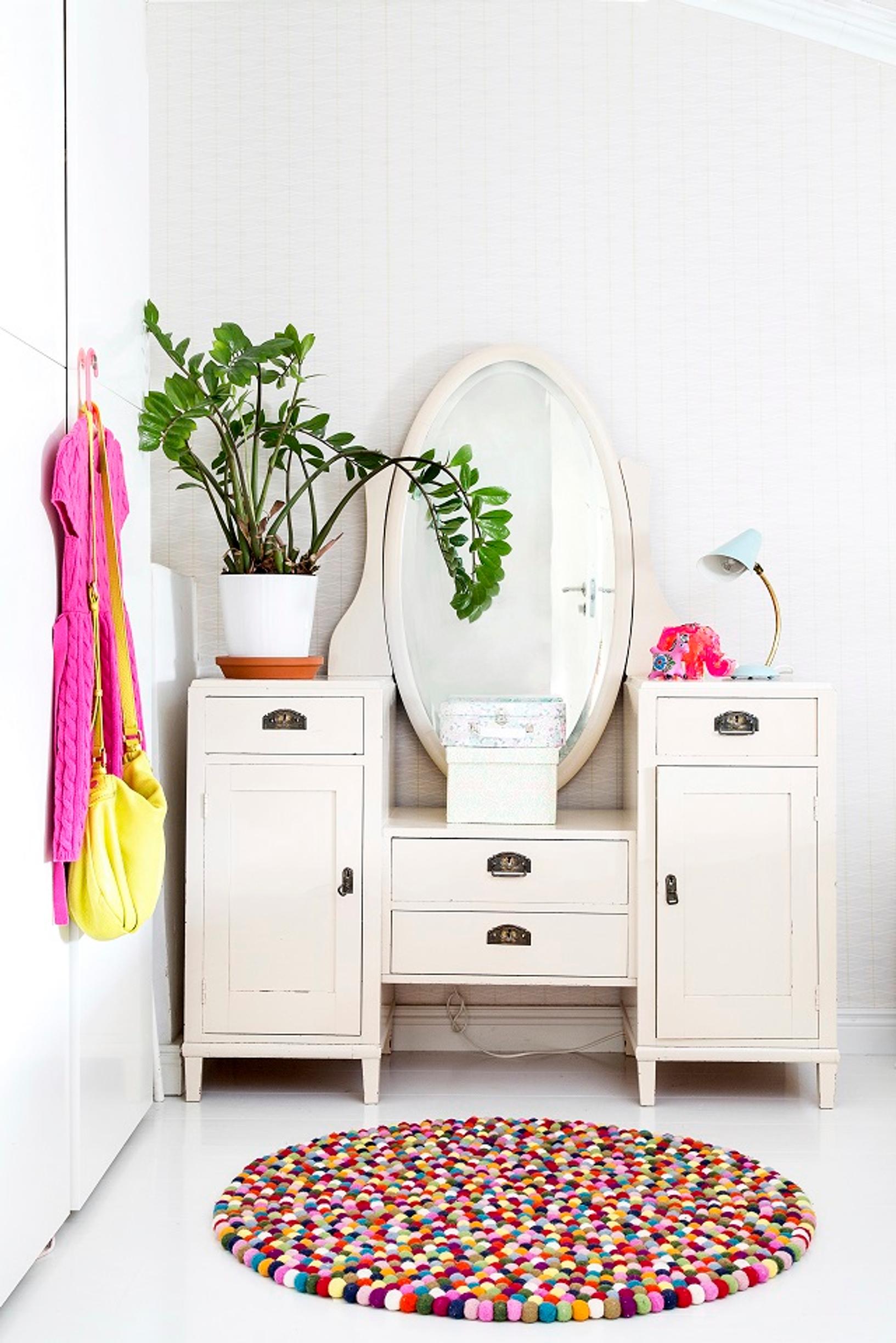 Kermanvärinen piironki on perheen isän mumman peruja ja turkoosi 50-luvun lamppu kirpputorilöytö. Matto on Hayn Pinocchio. Makuuhuoneen yhteydessä on myös kylpyhuone. ”Jos jokin kohta sisustuksessa ei toimi, emme osta uutta, vaan vaihdamme huonekalujen järjestystä. Olohuoneen sohvan paikka on vaihtunut jo kolme kertaa.”