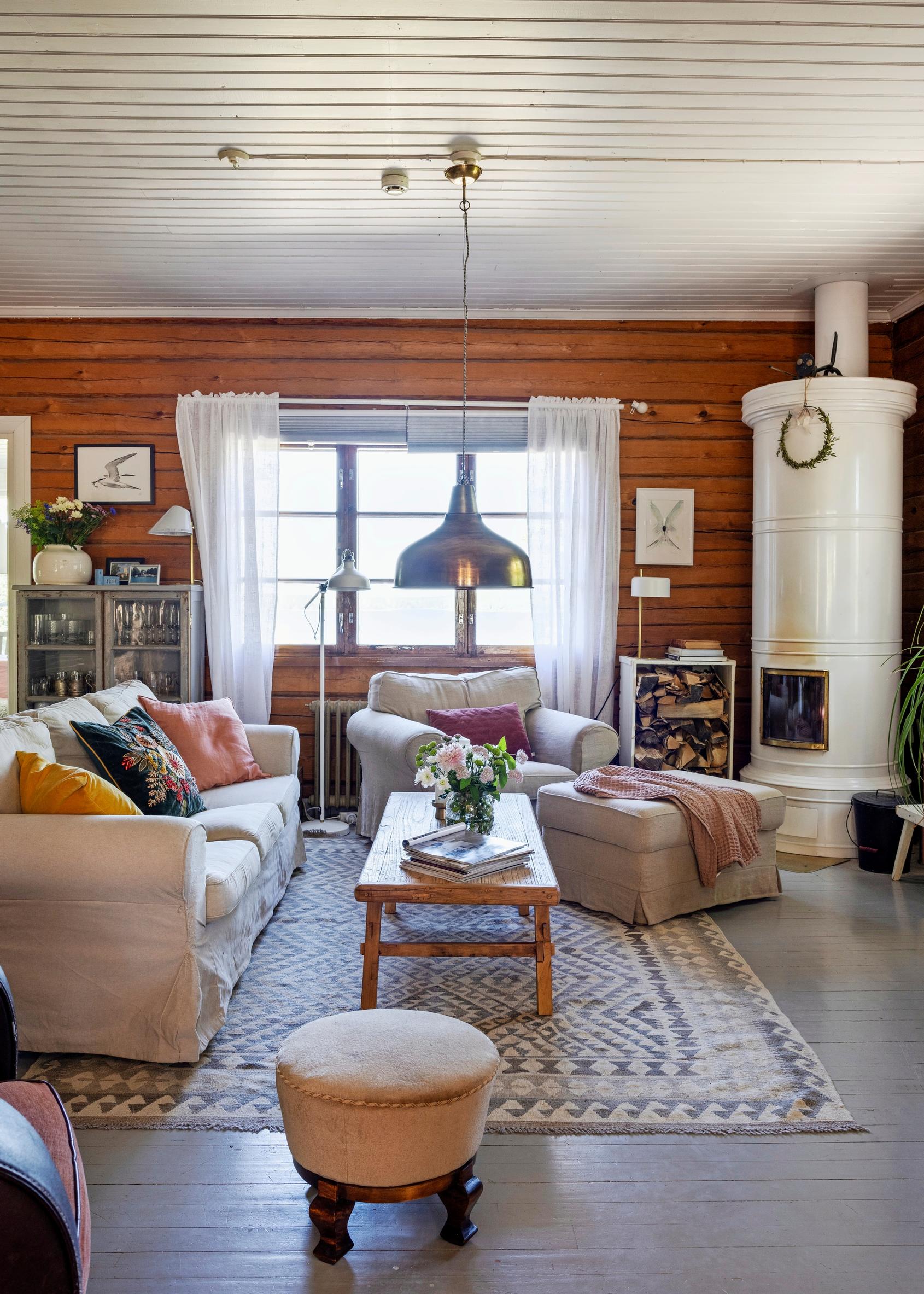 Olohuoneessa on Ikean Ektorp-sohva ja -nojatuoli sekä pihakirppikseltä löytynyt sohvapöytä. Kattovalaisin löytyi Tukholman-matkalta. Ikkunoista tehdyn kaapin päällä on Tynellin pöytävalaisin, joka löytyi kirpparilta vain 30 eurolla.