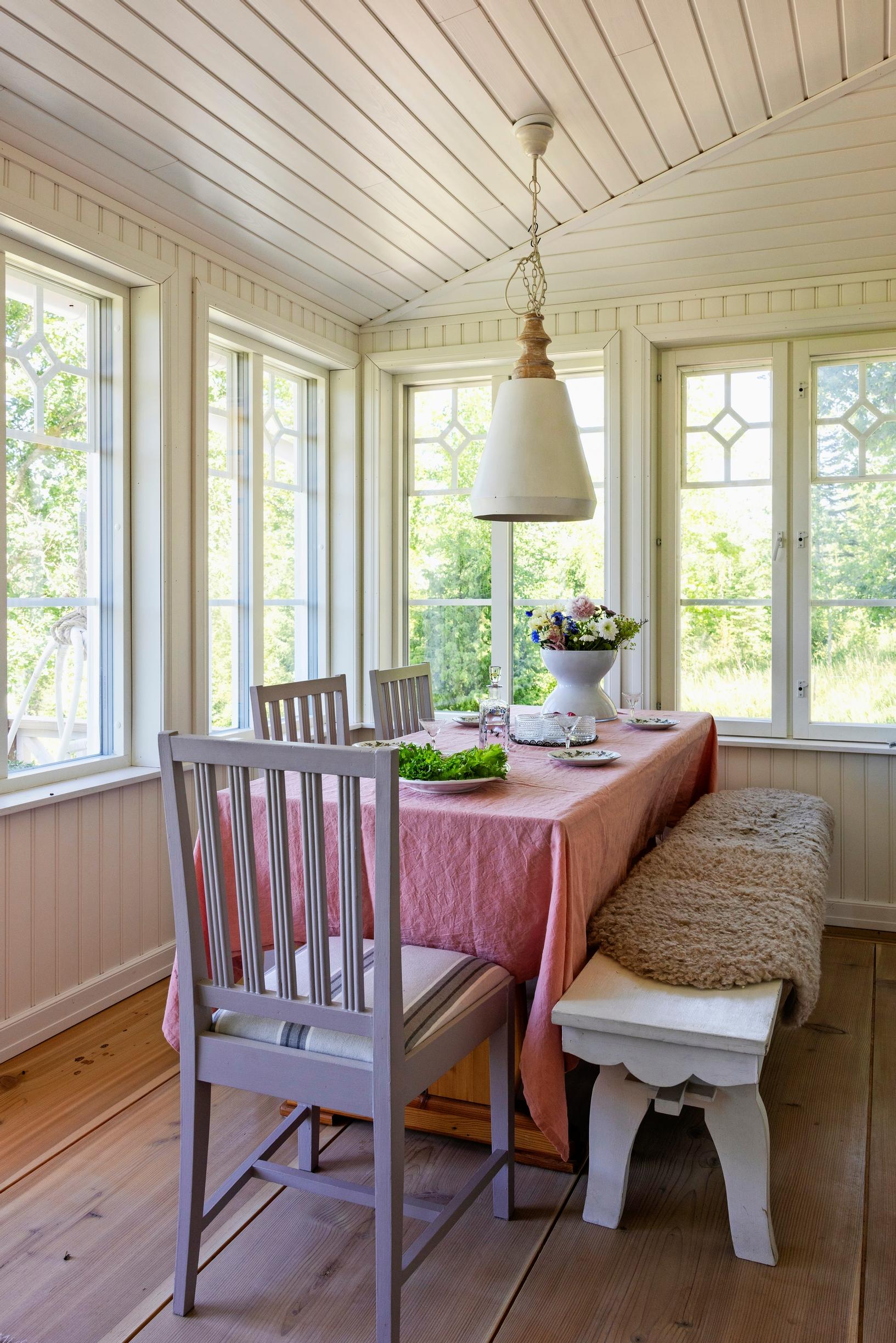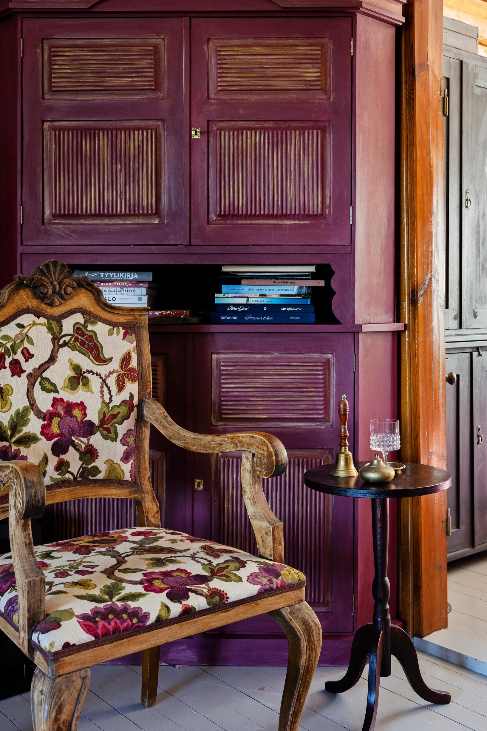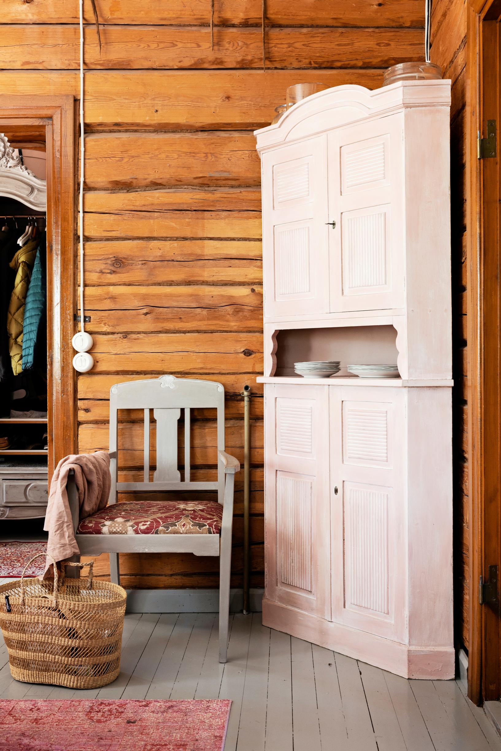 Ruokasalin nurkassa olevan, talon irtaimistoon kuuluneen kulmakaapin Heidi käsitteli kalkkimaalilla vaaleanpunaiseksi. Rinnalla on kirpputorilta löytynyt tuoli, jonka Heidi on maalannut ja Design West verhoillut.