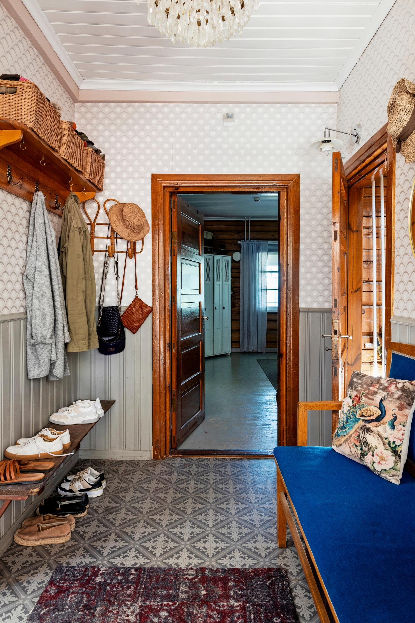 Eteiseen on asennettu Tarkettin kuviollinen muovimatto. Se on kahden koiran kanssa huoleton. Kenkähyllyt ovat aitan laarilautoja, ja naulakko on lähes alkuperäisellä paikallaan. Vanha Billnäsin puusohva on löytynyt kirpputorilta.
