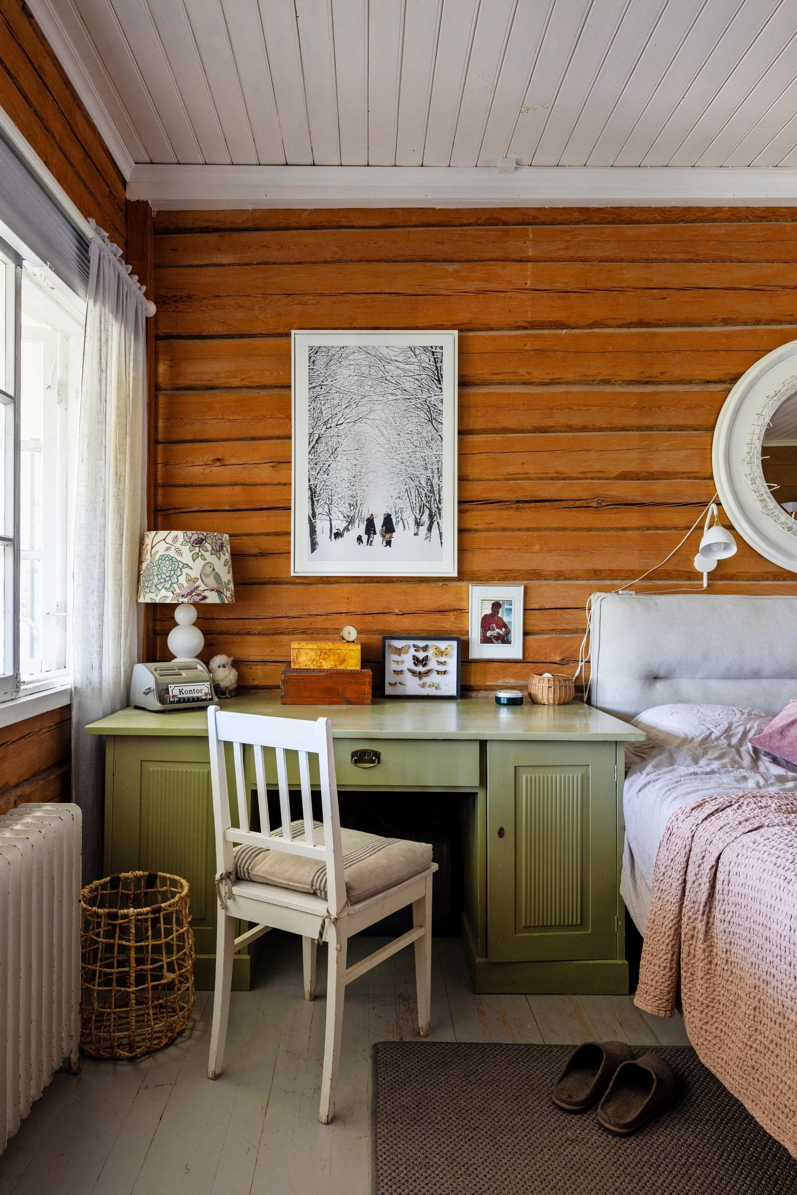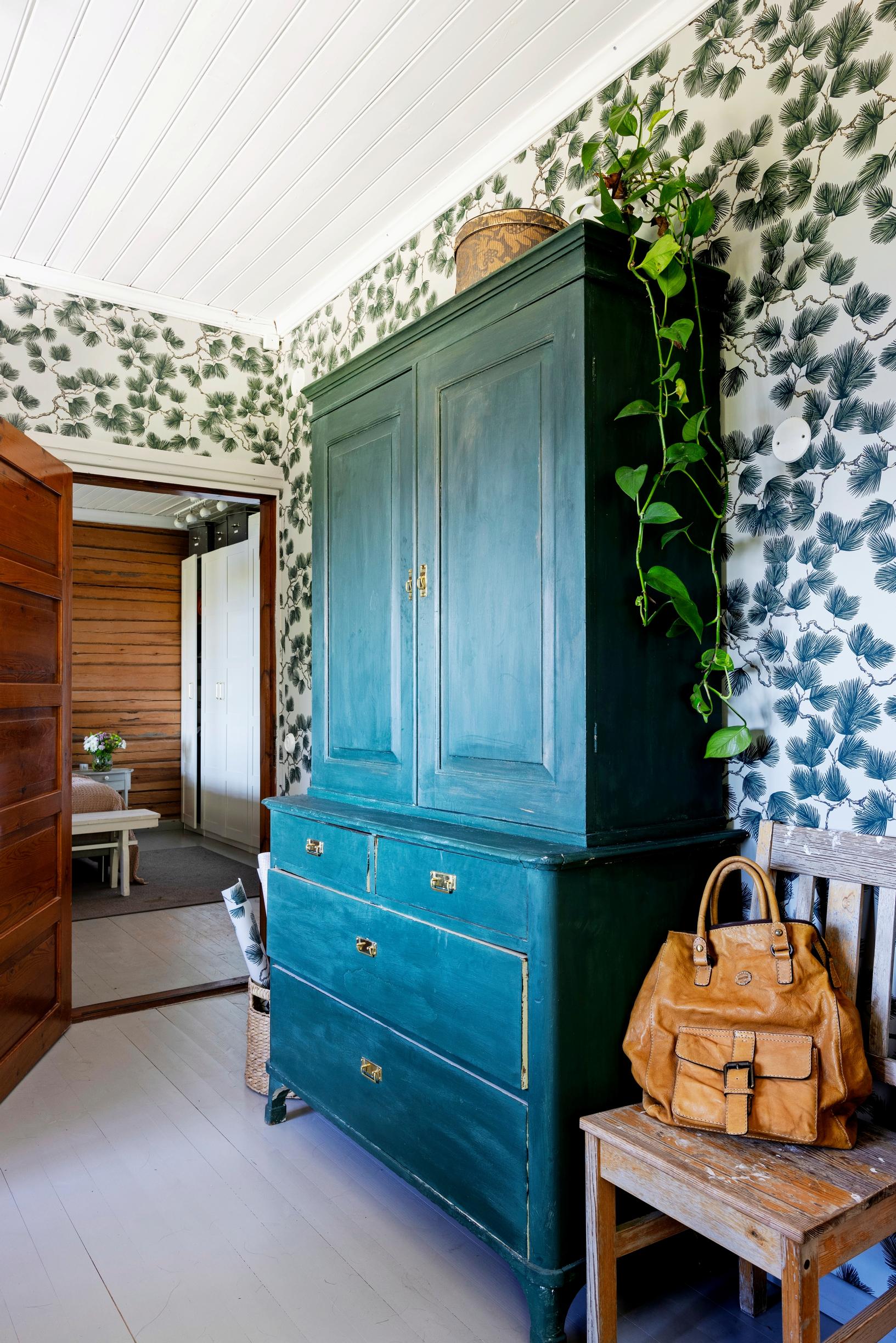 Pari vuotta sitten remontoitiin makuuhuoneen vieressä sijaitseva huone, joka on Heidin työhuone. Seiniin valikoitui Sandbergin Pine-tapetti, ja vanha kaappi sai sen jälkeen pintaansa uuden vihreän sävyn kalkkimaalein.