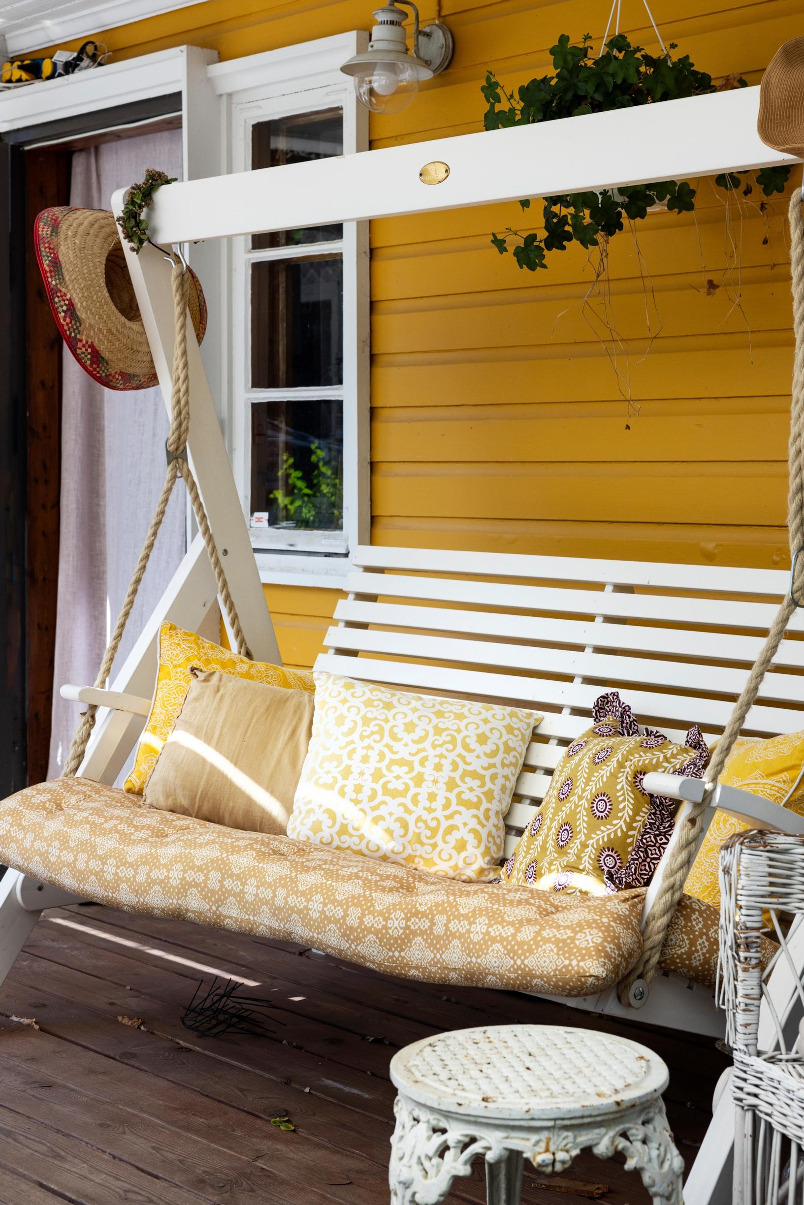 Sisäänkäynnin vieressä katoksen alla on pihakeinu, joka on pihan paras loikoilupaikka. Toisinaan pieni lepotauko lounaan jälkeen saattaa livahtaa päiväunien pituiseksi.