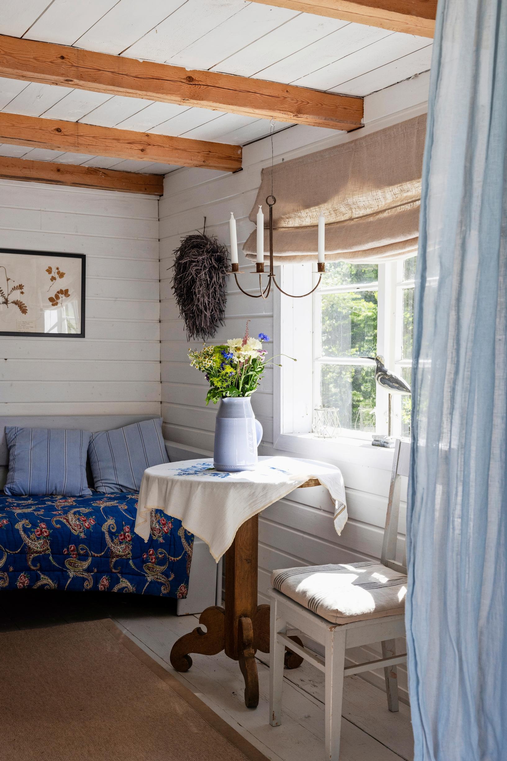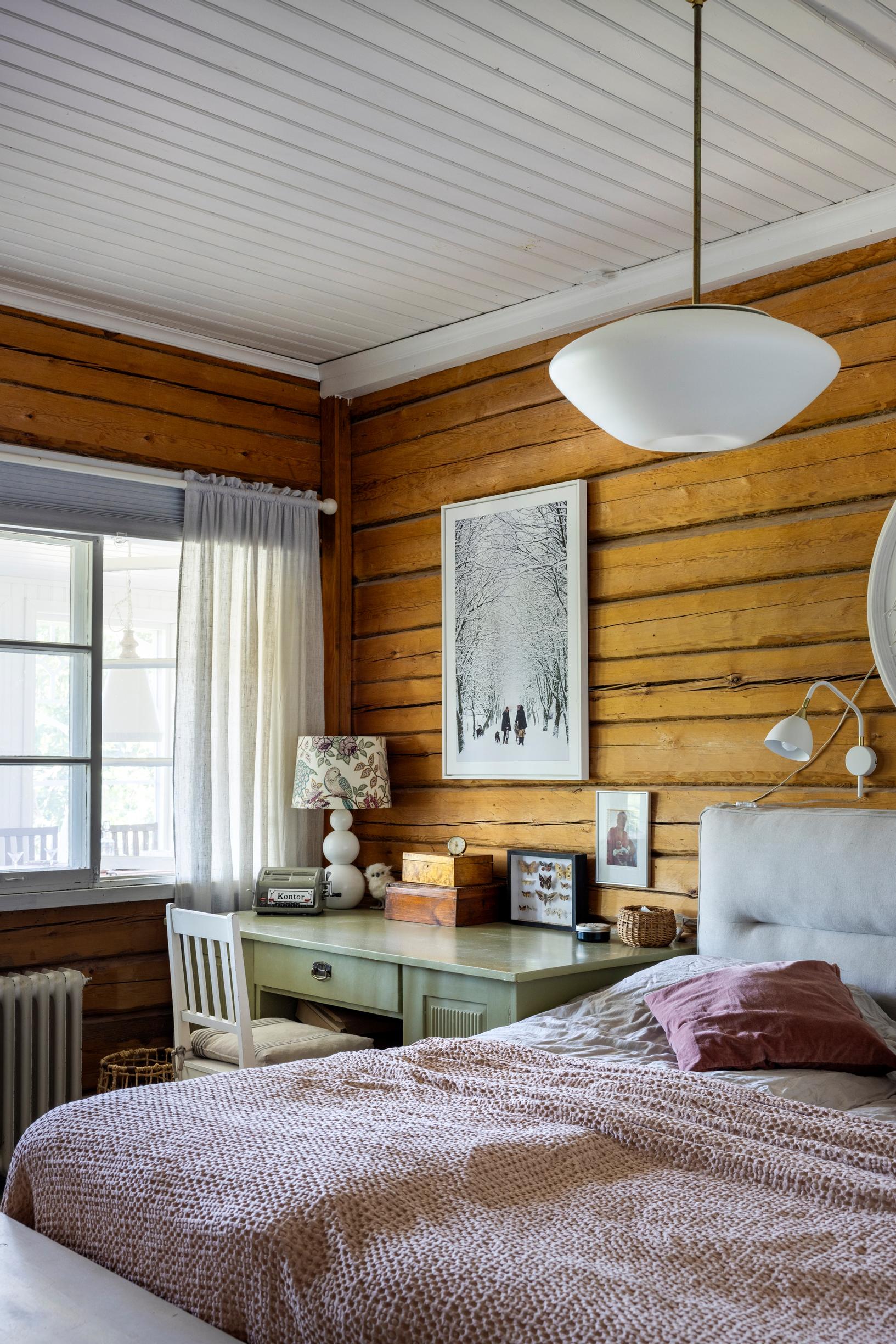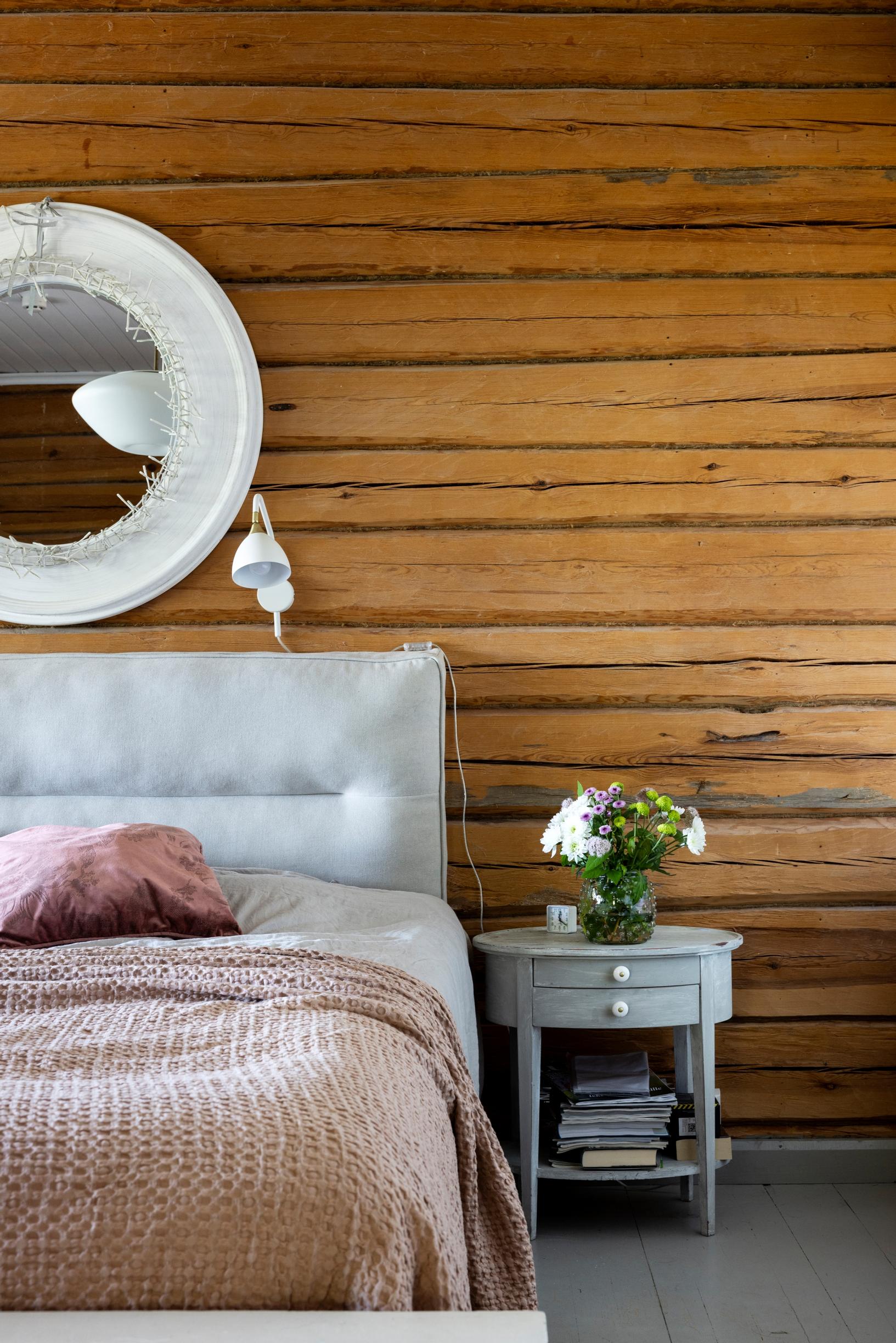 Talo on rakennettu kauttaaltaan hirrestä. Kuulopuheiden mukaan talon hirret on aikoinaan tuotu jostain saaresta. Niiden kitukasvuinen ja tiivis rakenne on paikoitellen niin kovaa, ettei siihen meinaa saada naulaa uppoamaan. Makuuhuoneessa oli mahdollisesti ollut joskus aiemmin pinkopahvitus, mutta jo heidän tullessa taloon se oli hirrellä ja sai sellaiseksi jäädäkin. Yöpöytä on yksi Heidin kirppislöydöistä. Senkin hän on maalannut kalkkimaalilla uuteen sävyyn.