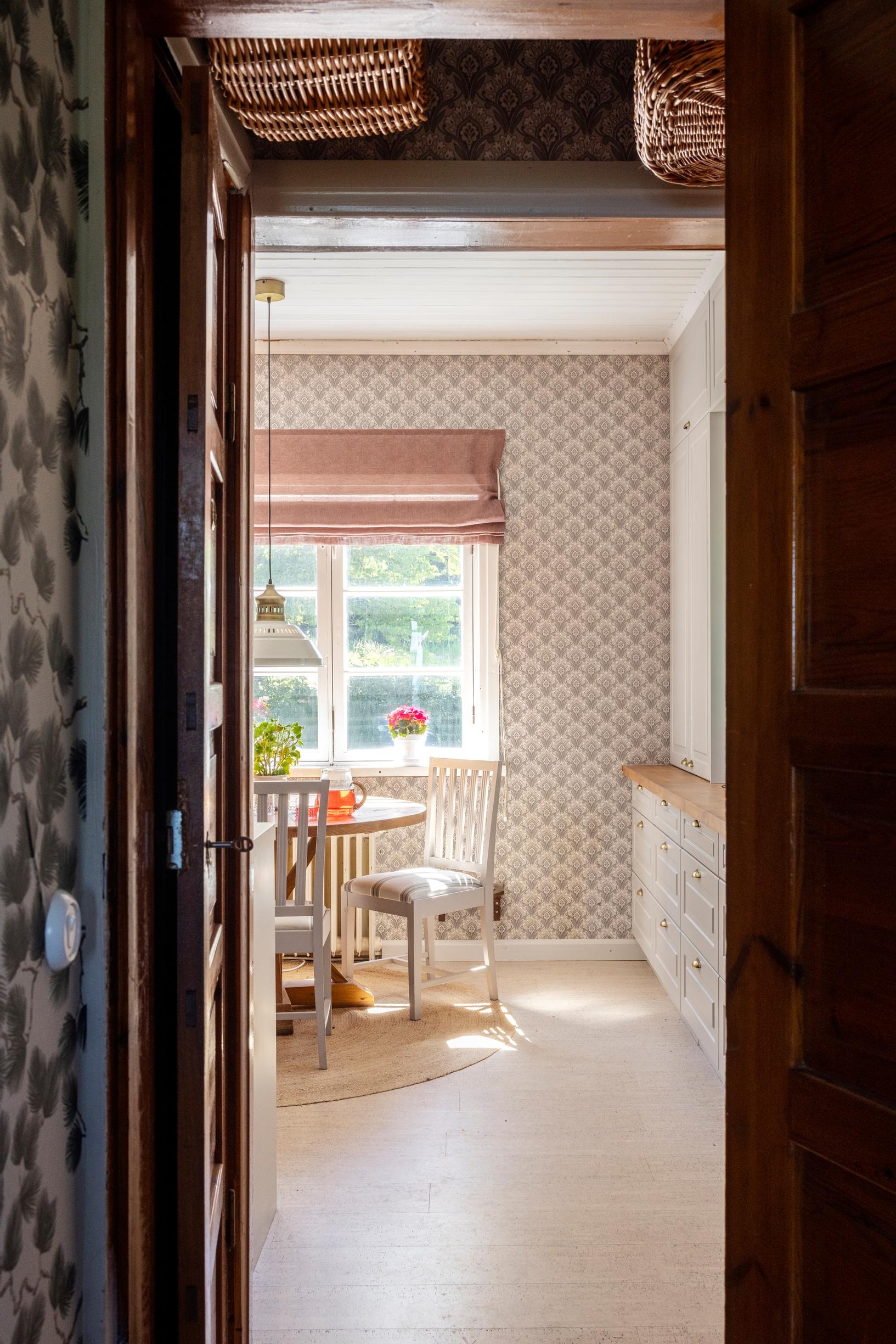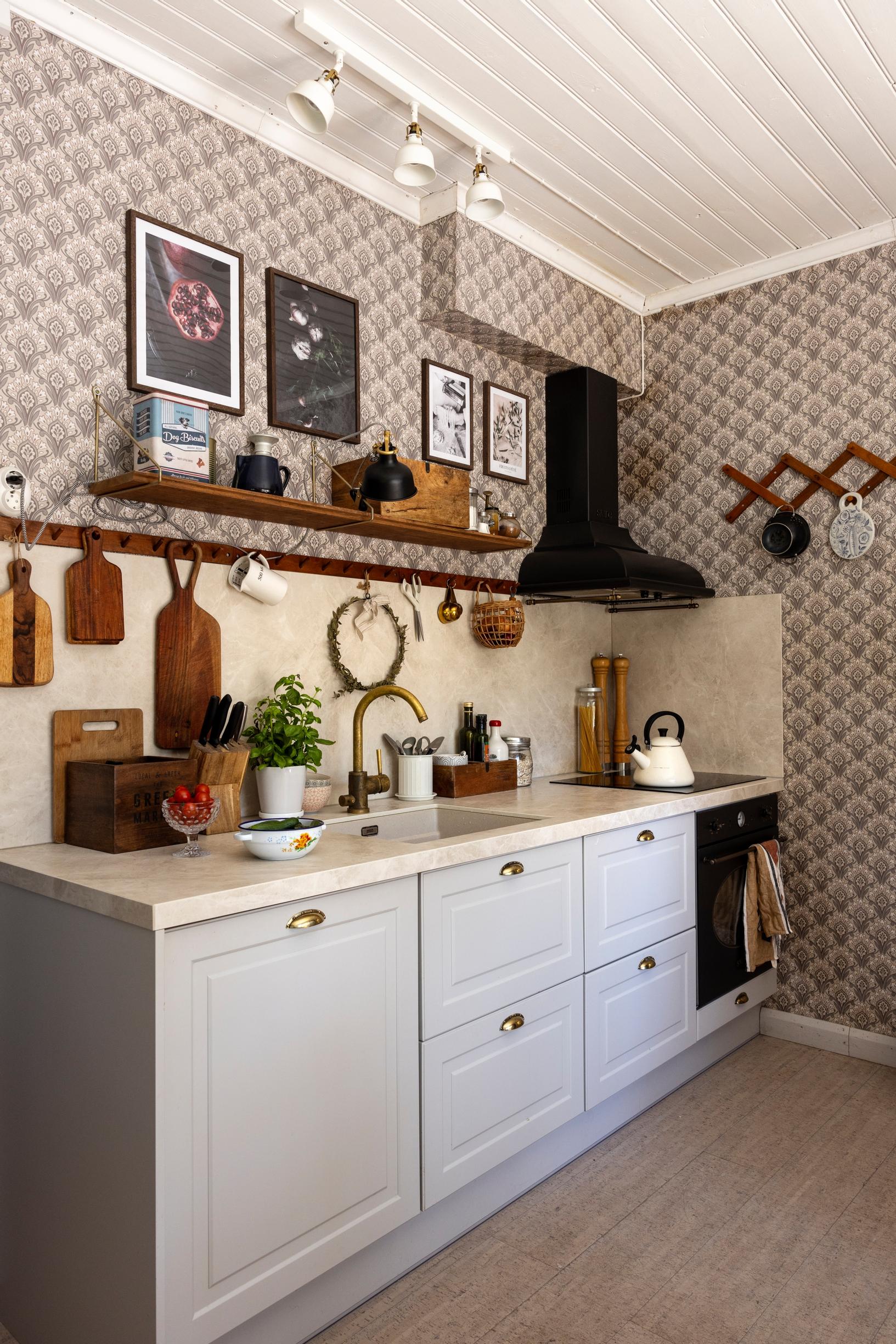 Hyasintti-tapetti sopii vanhaan taloon. Keraaminen taso ja tausta ovat huolettomia materiaaleja. Keittiön lattia on Wicandersin hydrokorkkia, joka on osoittautunut mainioksi materiaaliksi koirakodissa.
