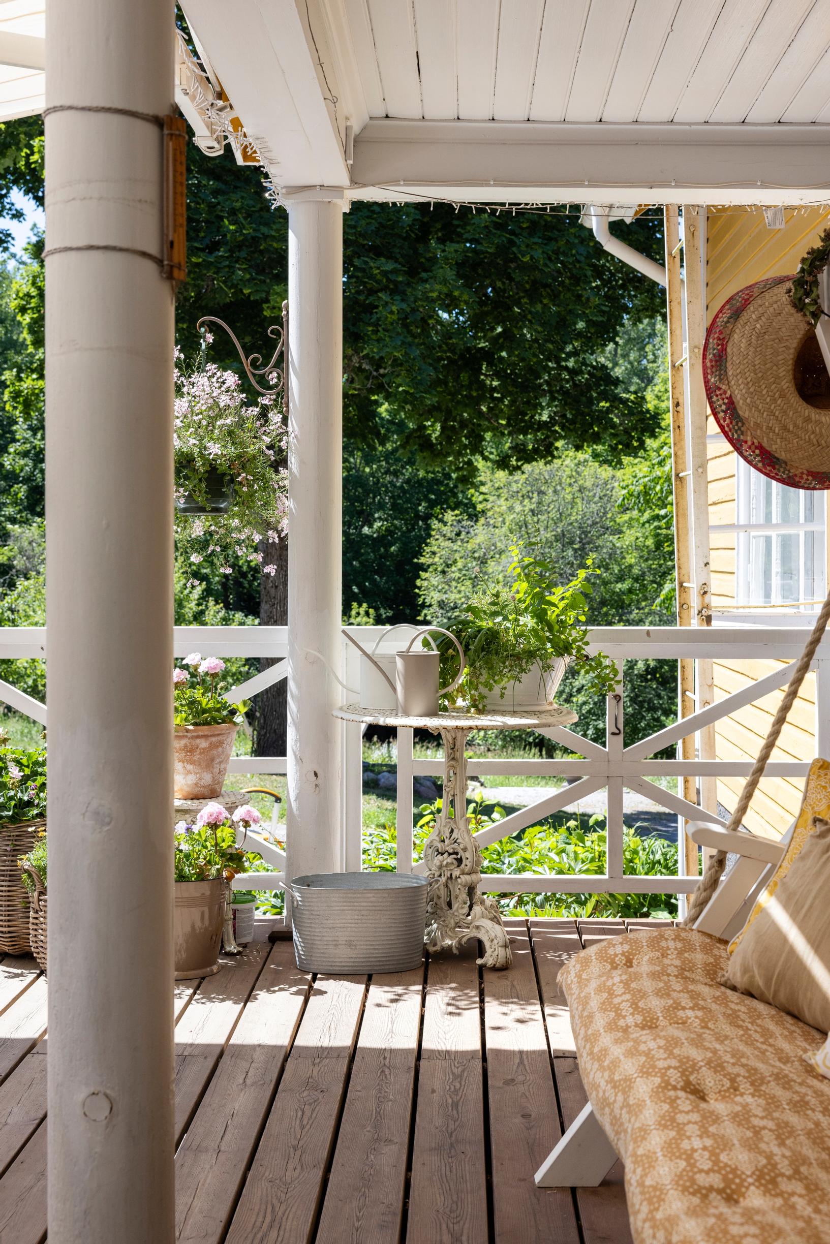 Talo oli näyttävä jo aikaisemminkin, mutta julkisivultaan hieman ehkä mereltä päin katsottuna tylsä. Koko talon luonne muuttui uuden verannan myötä. Heidi suunnitteli verannan kaiteet itse ja tilan alle Markku sai oman pienen verstaansa. Terassiosan alle saadaan pihakalusteet mahdutettua talveksi suojaan.