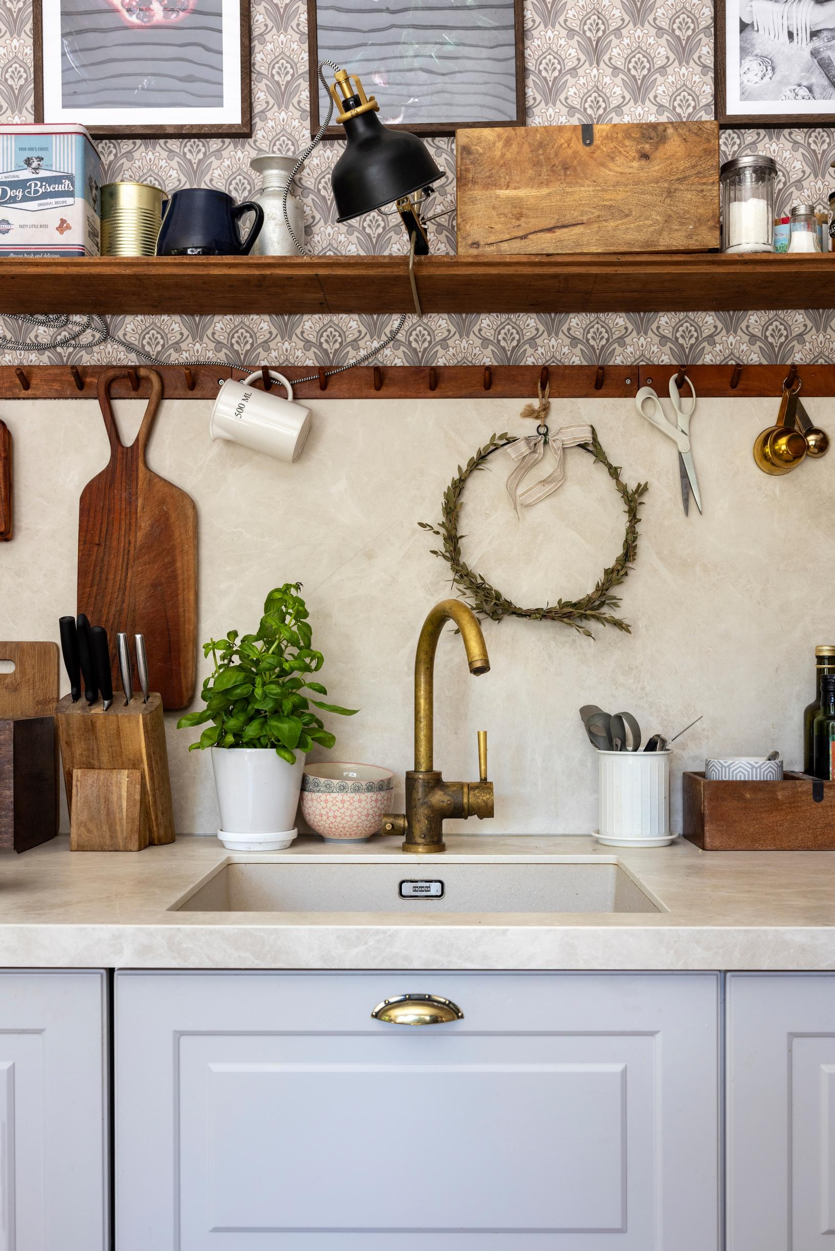 Keittiön hyllyt on valmistettu piha-aitasta puretun laarin laudoista. Ne pestiin hyvin ja käsiteltiin ruskeaksi. Tähän ne sopivat kauniisti tumman nuppinaulakon ylle. Allas on Franken, ja hana löytyi Tapwellin valikoimista.