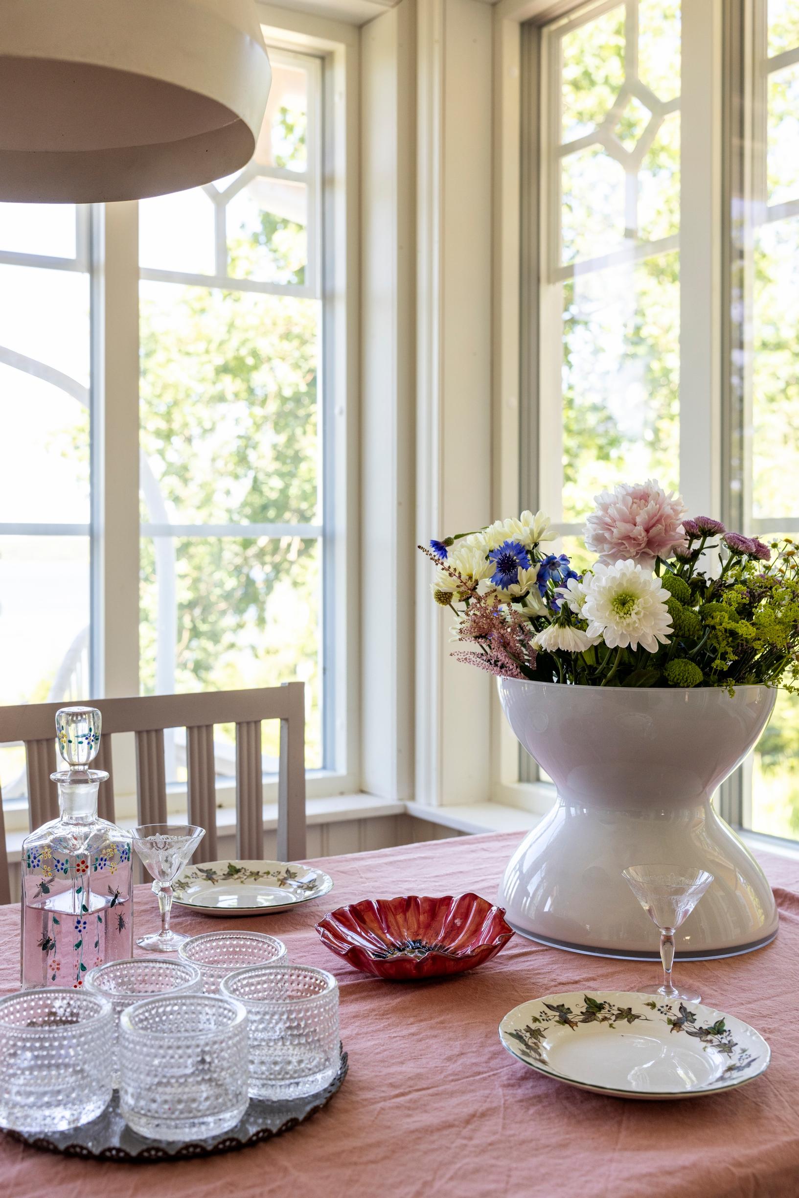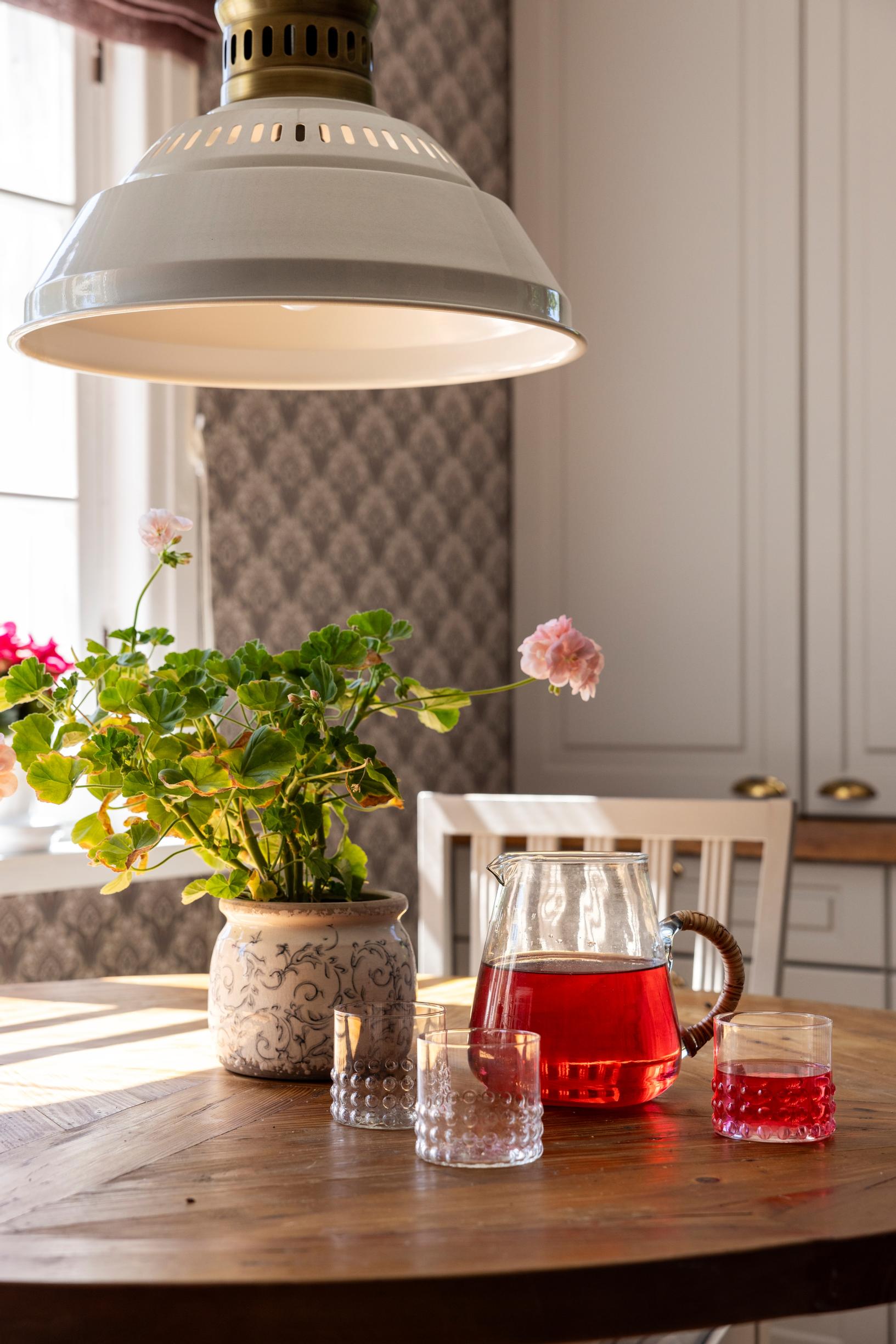 Kannu ja lasit ovat kirppislöytöjä. Heidi on keräillyt jo vuosia Nanny Stillin Grappo-sarjan laseja.
