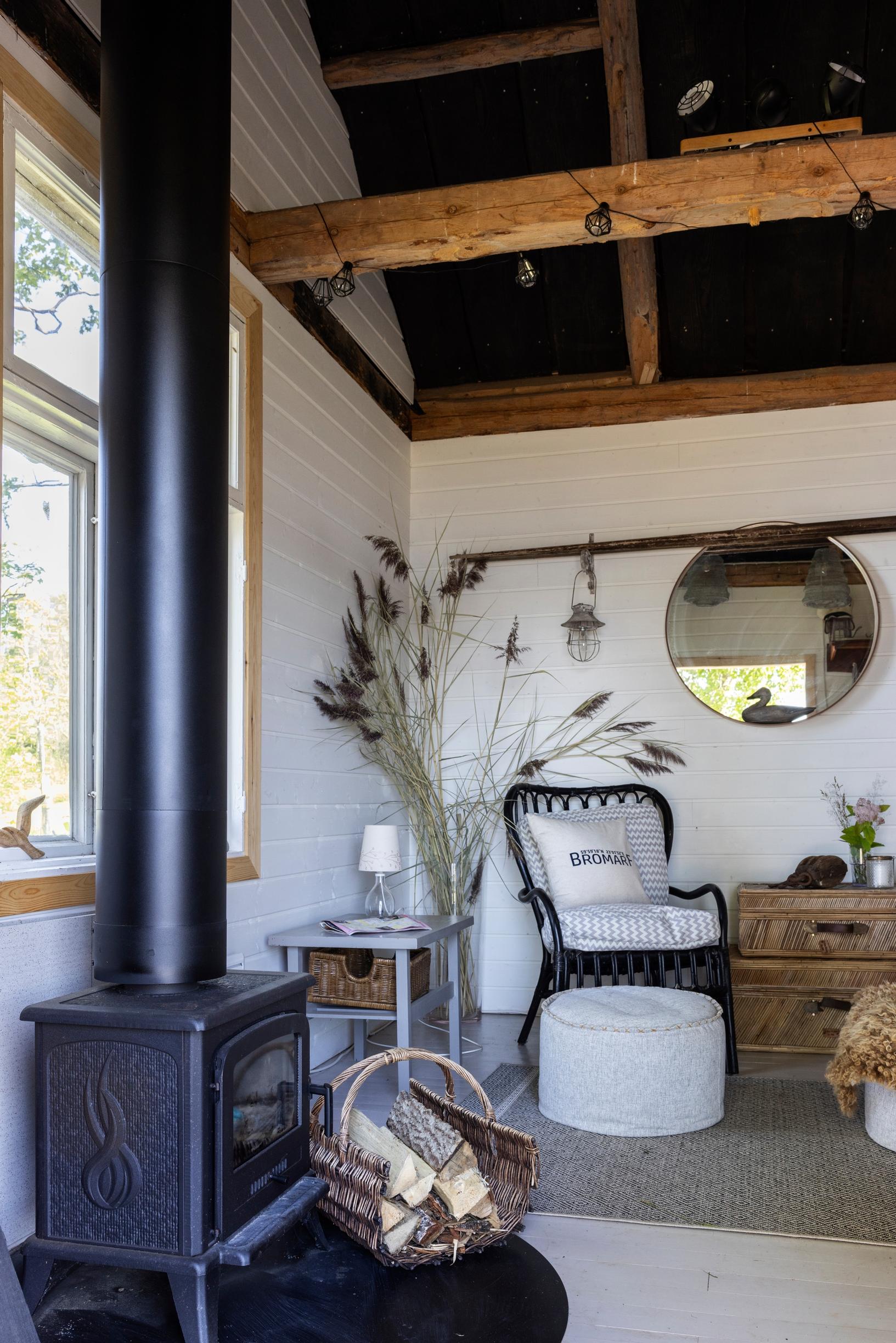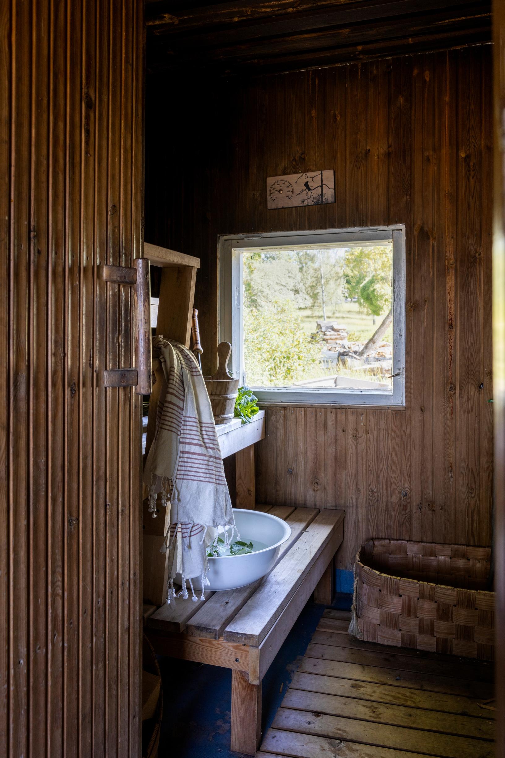 Vanha rantasauna oli todella huonossa kunnossa, kun paikka tuli Heidille ja Markulle. Heidän naapurissaan asuu osaava timpuri, joka teki tilaan uuden lattian, aukotti seinään ikkunalle paikan ja muutti hieman tilajakoa. Nyt rantasaunan tupa on viihtyisä ja kaunis. Tulisijan myötä siellä tarkenee talviaikaankin.