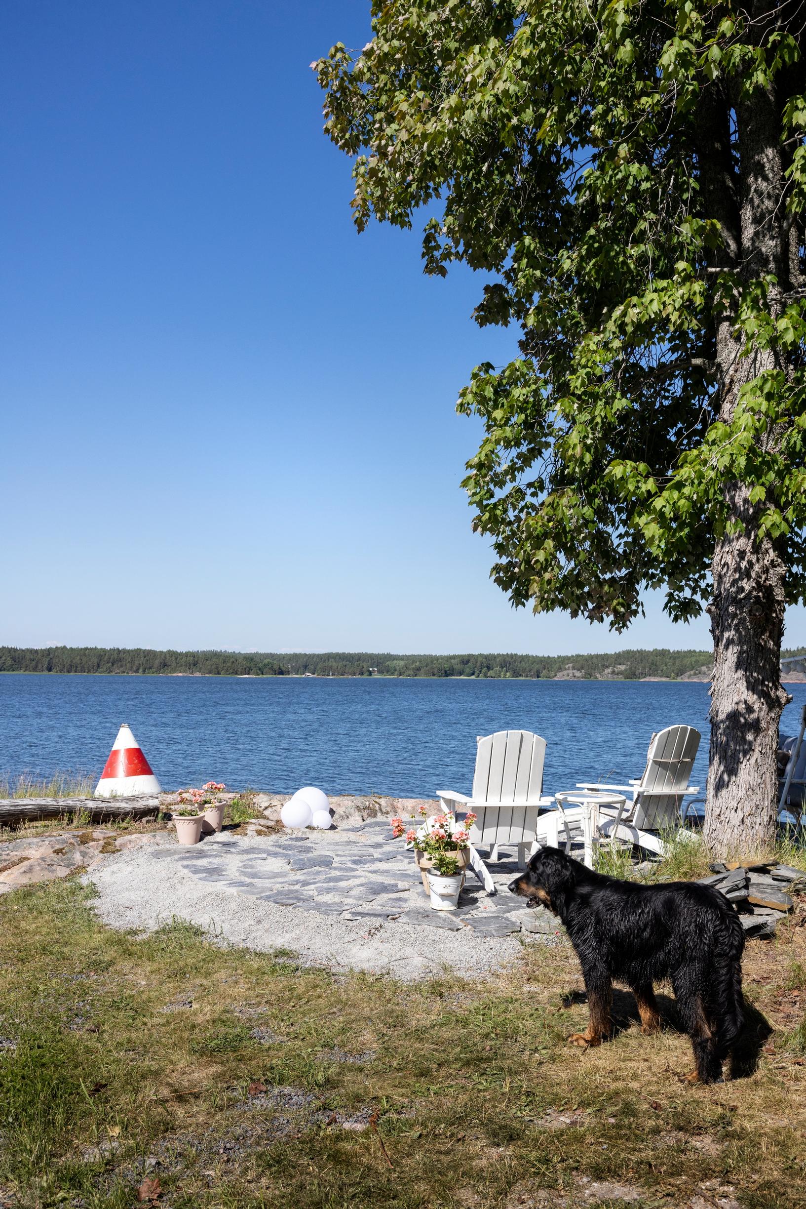 Meri on pariskunnalle tärkeä elementti. Koska meri muuttuu joka päivä, juuri se tekee siitä niin viehättävän. Rannan liuskekivitasanne tehtiin viime kesänä. Valkoiset aurinkotuolit ovat olleet rannassa lähes alusta saakka, kun he muuttivat taloon, mutta nyt niille on hyvä ja tasainen paikka kivetyksellä.