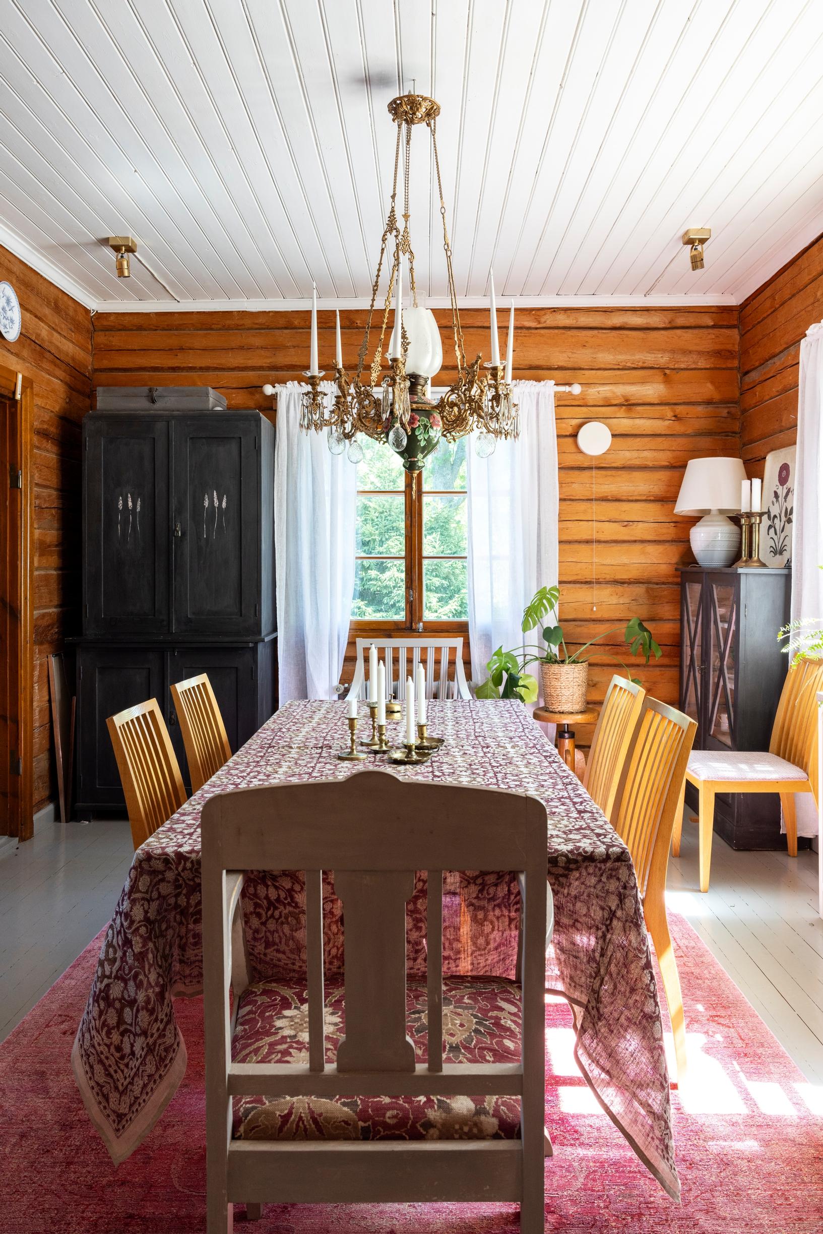 Ruokasalissa on suuri pöytä, jonka ääressä viihdytään tunteja, kun tulee vieraita. Pöydällä on yksi Heidin hankkimista Chamoisin pöytäliinoista. Matto löytyi Rugvistasta. Majolikaposliininen kattokruunu on Heidin mummin lapsuudenkodista. Salin katossa se on nyt arvoisellaan paikalla.