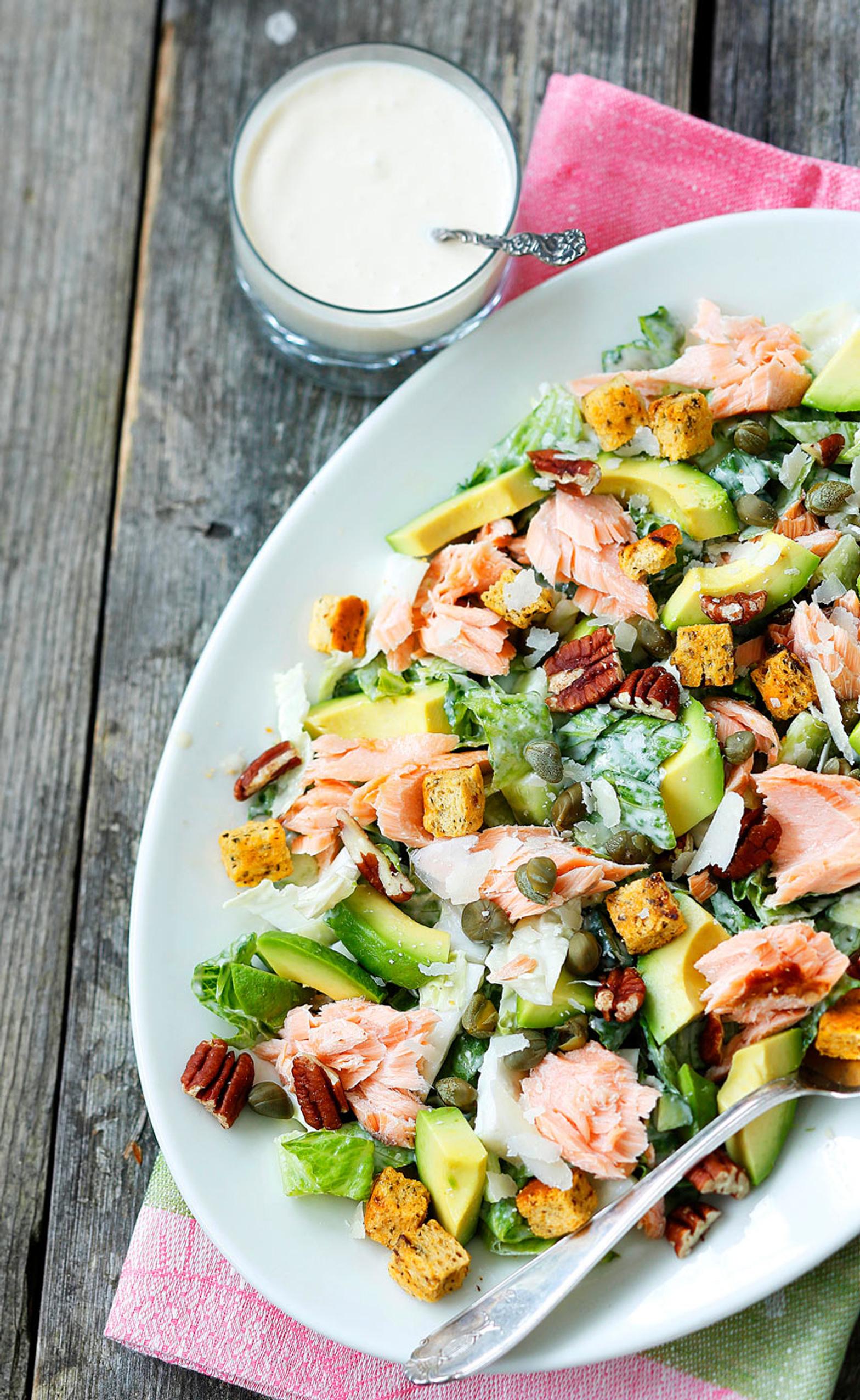 Lisää caesarsalaatin perusohjeeseen savustettua lohta, avokadoa ja kapriksia. Näin saat perinteistä versiota ruokaisamman caesarsalaatin.