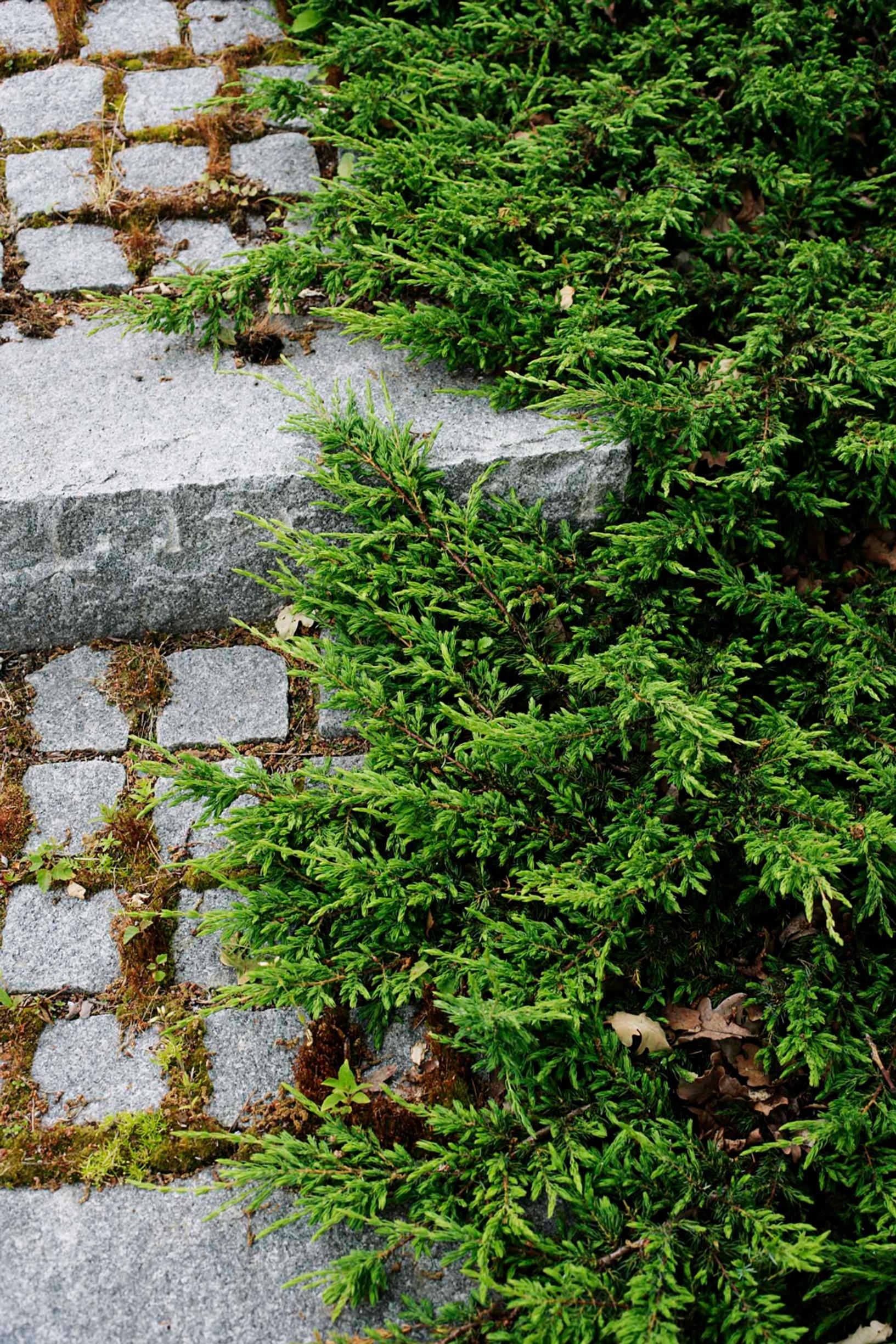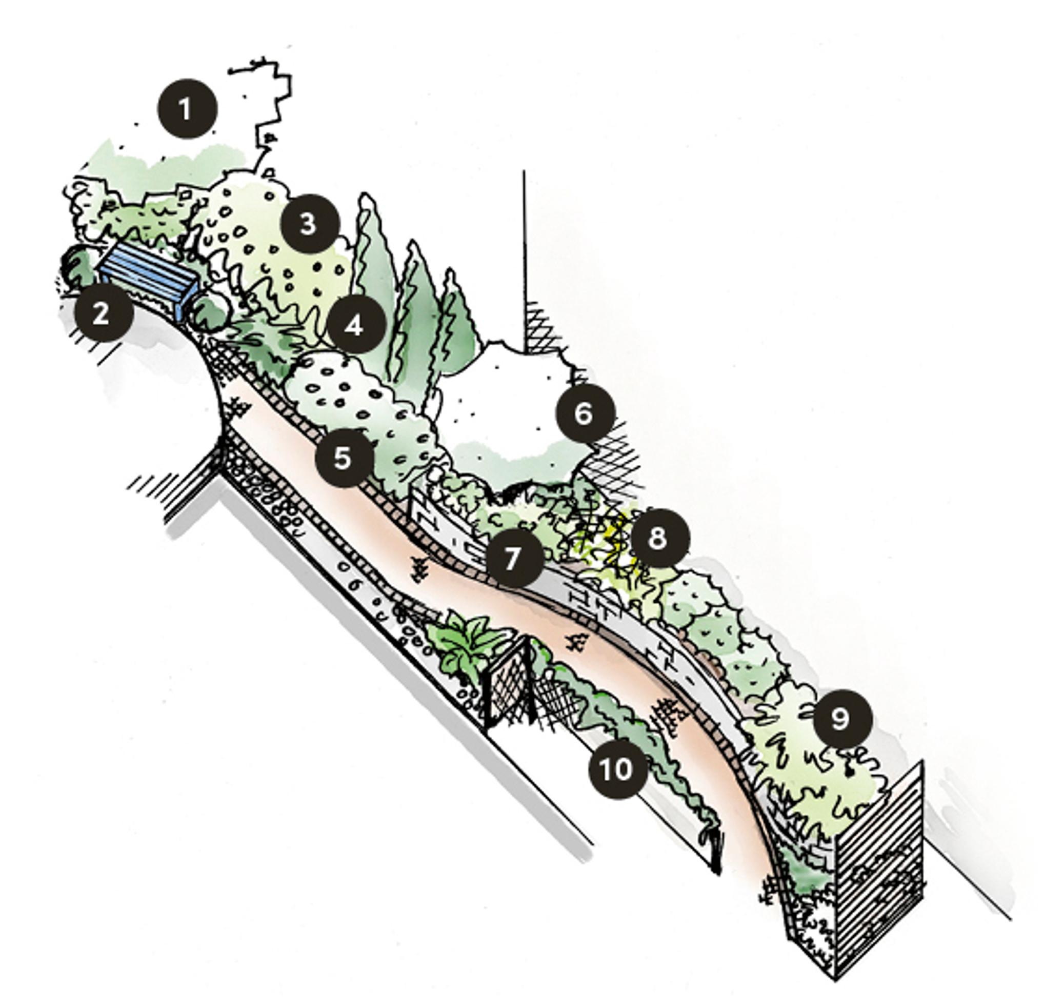 Kasvillisuutta myötäilee lämpimän sävyisistä punagraniittisista noppakivistä ladottu polku. Se sijoitettiin alueen reunaan, jotta istutuksille jäisi mahdollisimman suuri yhtenäinen tila. Polun kaarevuus tuo tilaan pehmeyttä ja auttaa pitämään aiemman kuilumaisen tunnelman loitolla.
