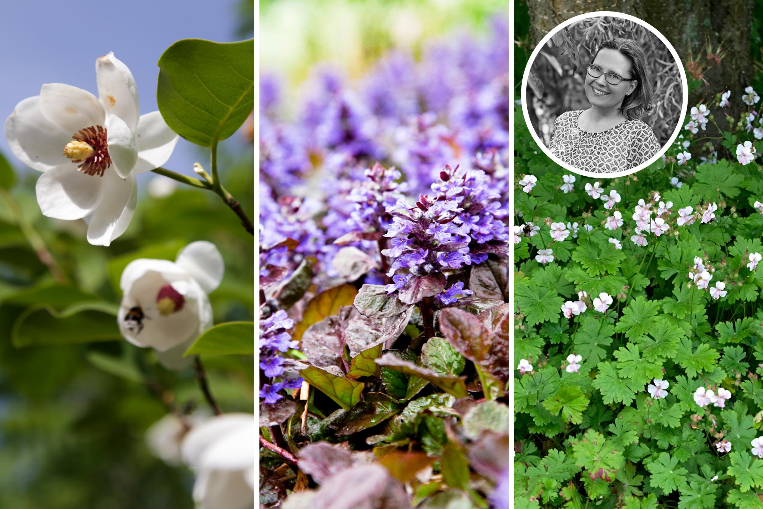 2. Penkin ympärillä pallotuija, rentoakankaali, jalopähkämö, krookus ’Jean d’Arc’ ja ukkolaukka ’Purple Sensation’