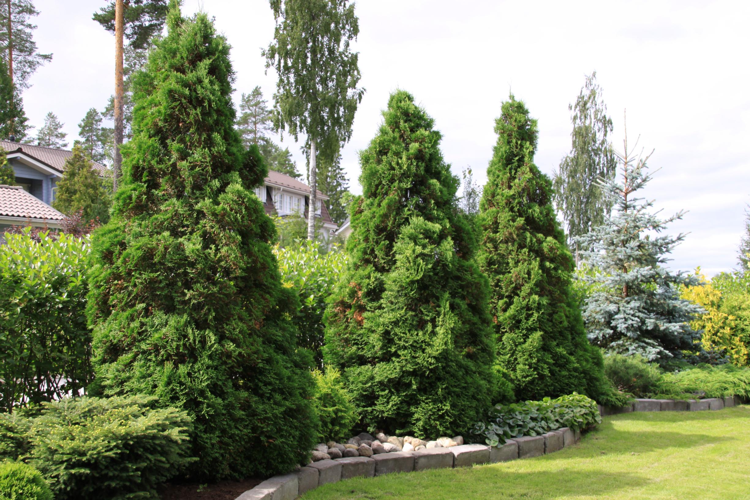 Toteutus: Suunnitelman ajatuksena oli ottaa pihan hukkaneliöt käyttöön ja tarjota asukkaille viehättävä ja elämyksellinen kulkureitti takapihan oleskelupaikalle. Naapuritalon ikkunattoman seinän viereen tehtiin 9 neliön kokoinen (50 cm korkea) istutusallas pensaille ja perennoille, minkä avulla varjoisaan tilaan saatiin pehmeyttä ja kerroksellisuutta. Kasveissa hyödynnettiin mahdollisimman paljon erilaisia muotoja ja vihreän sävyjä, kuten pensasmagnoliaa, kotkansiipeä ja peittokurjenpolvea. Takapihan puolella timanttituijat, virpiangervo ja sirotuomipihlaja tuovat näkösuojaa. Monikerroksellisen kasvillisuuden ansiosta tunnelma on metsäinen, vaikka tilassa ei ole puita.