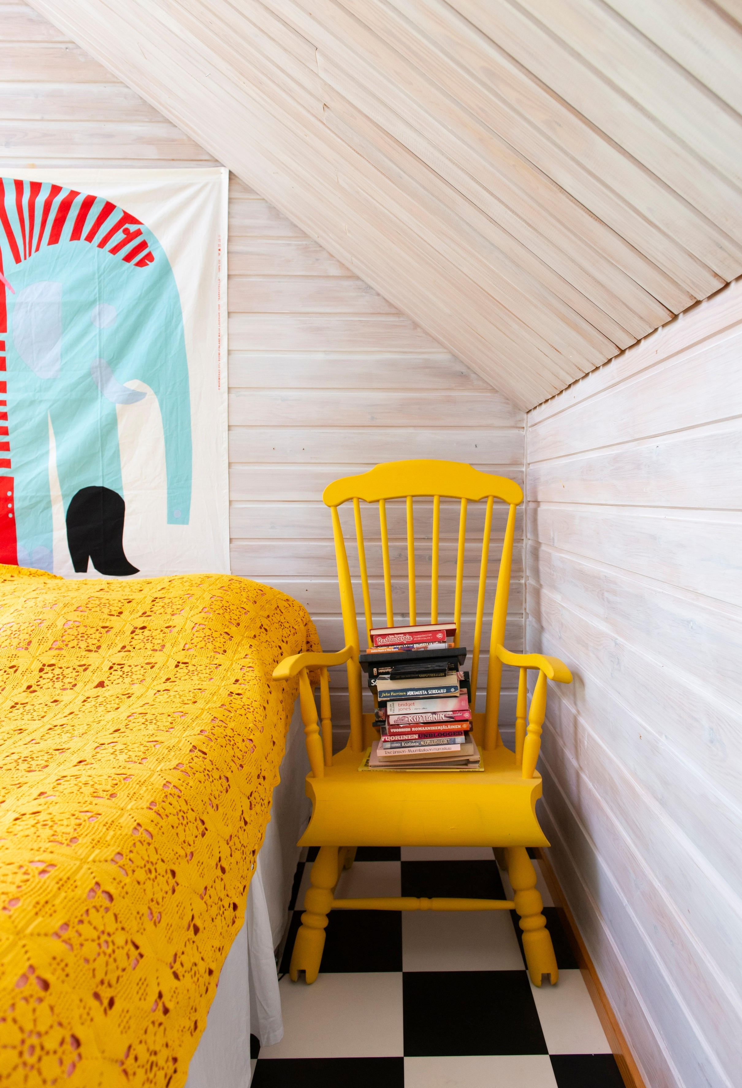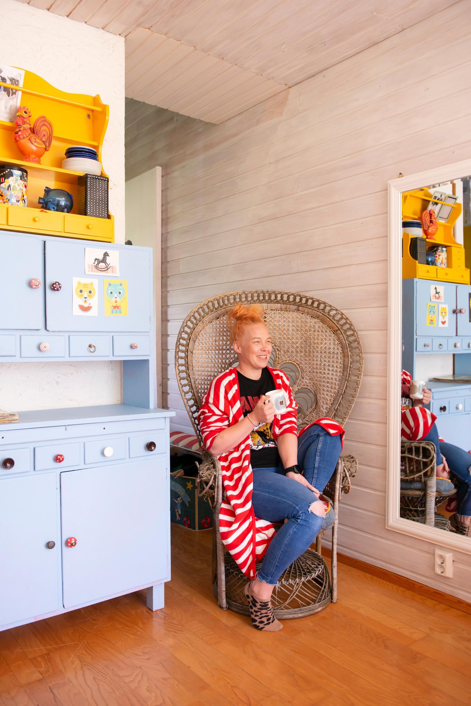 • Keksi uutta käyttöä tavaroille. Huvikumpumaiseen sisustukseen kuuluu, että tavarat vaihtavat käyttötarkoitusta luovasti. Meillä vanha nukensänky toimii kukkapöytänä, keinutuolista on tehty yöpöytä ja kasseista ommeltu tyynynpäällisiä.