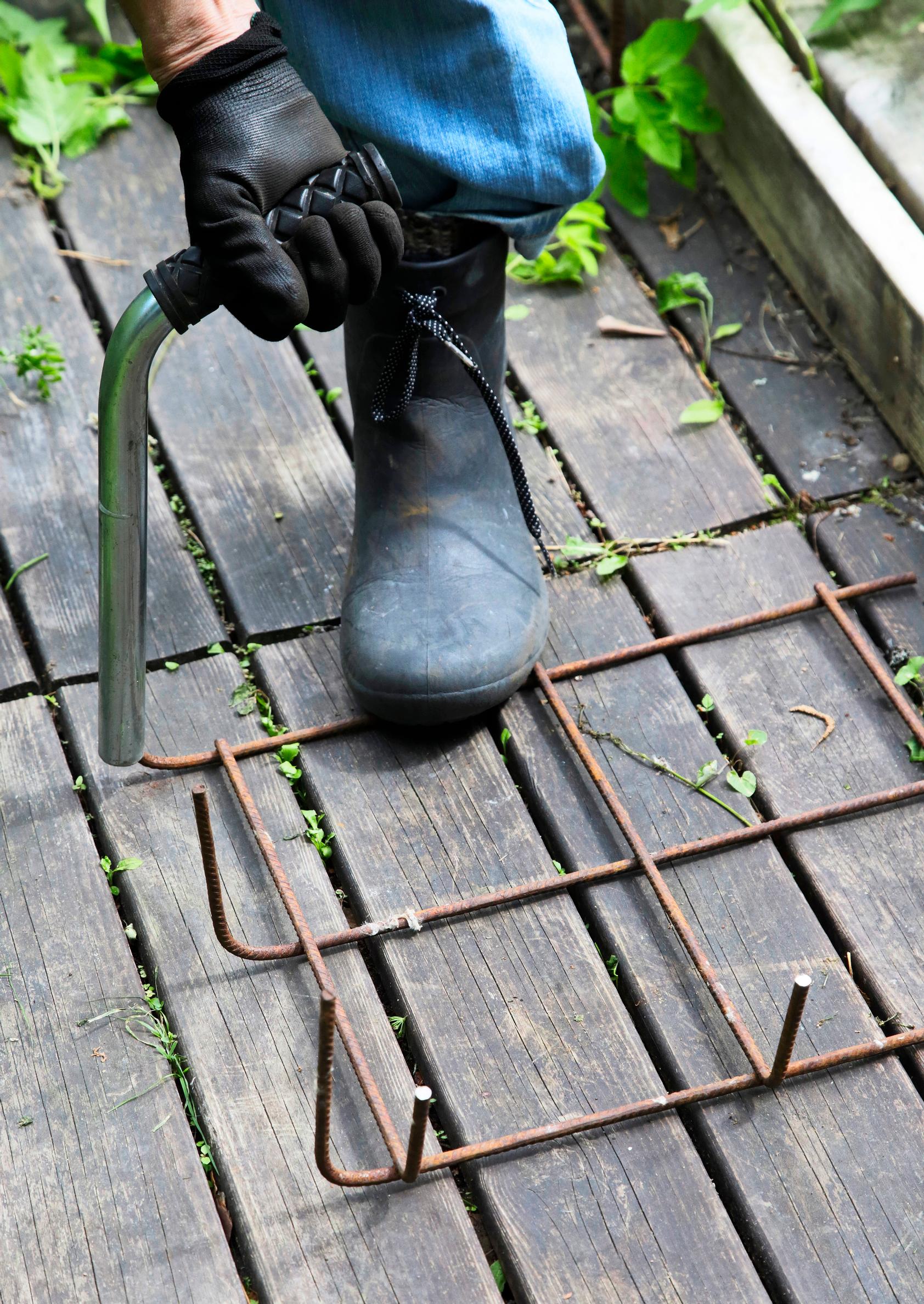 3. Katko harjateräksestä sopivia tankoja kulmien tuiksi. Taivuta tankojen päät 90 asteen kulmaan putkenpätkällä. Paina näitä tukia kulmiin jäykistämään kehikkoa. Tangoista voi ripustaa lyhtyjä ja amppeleita.