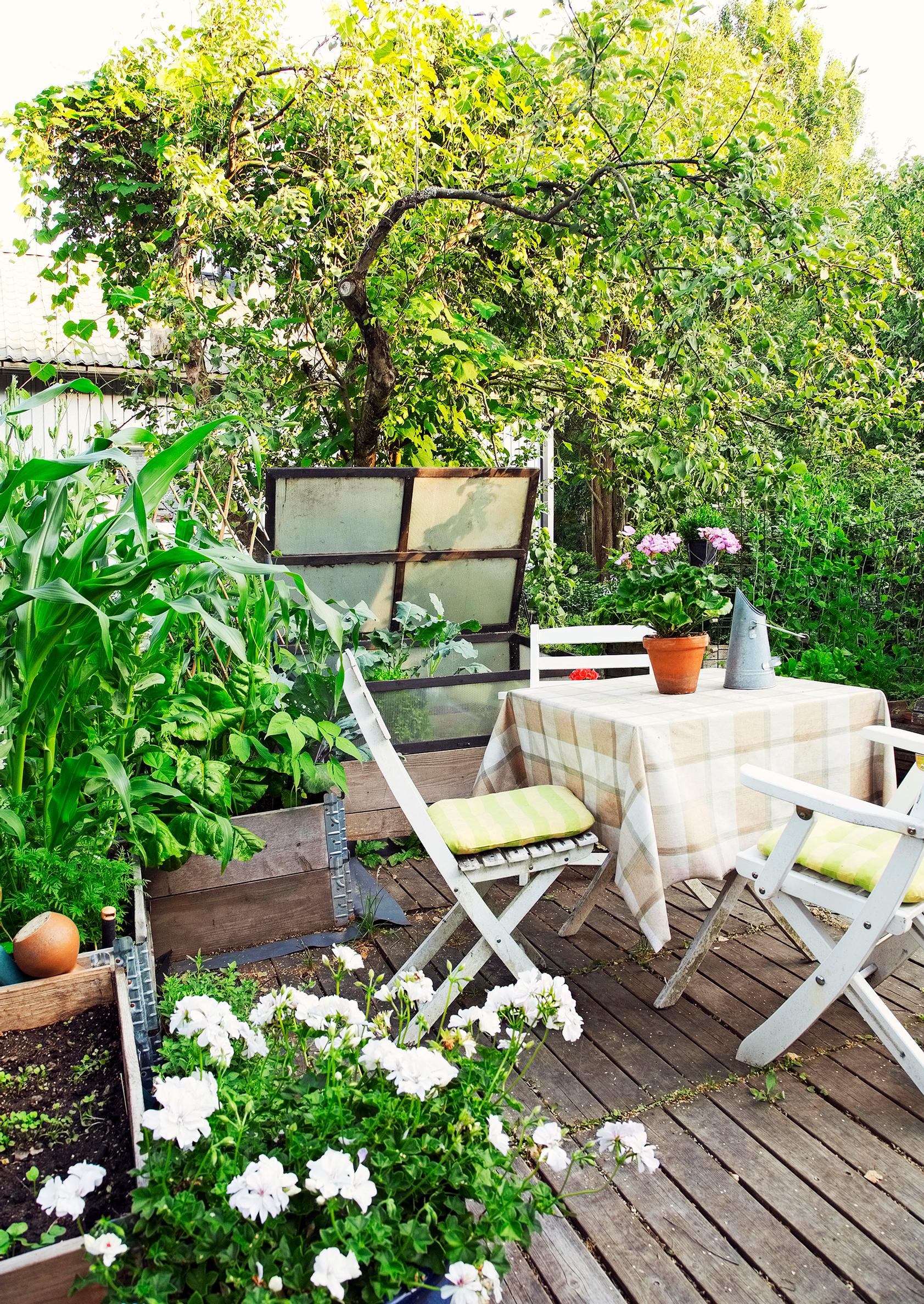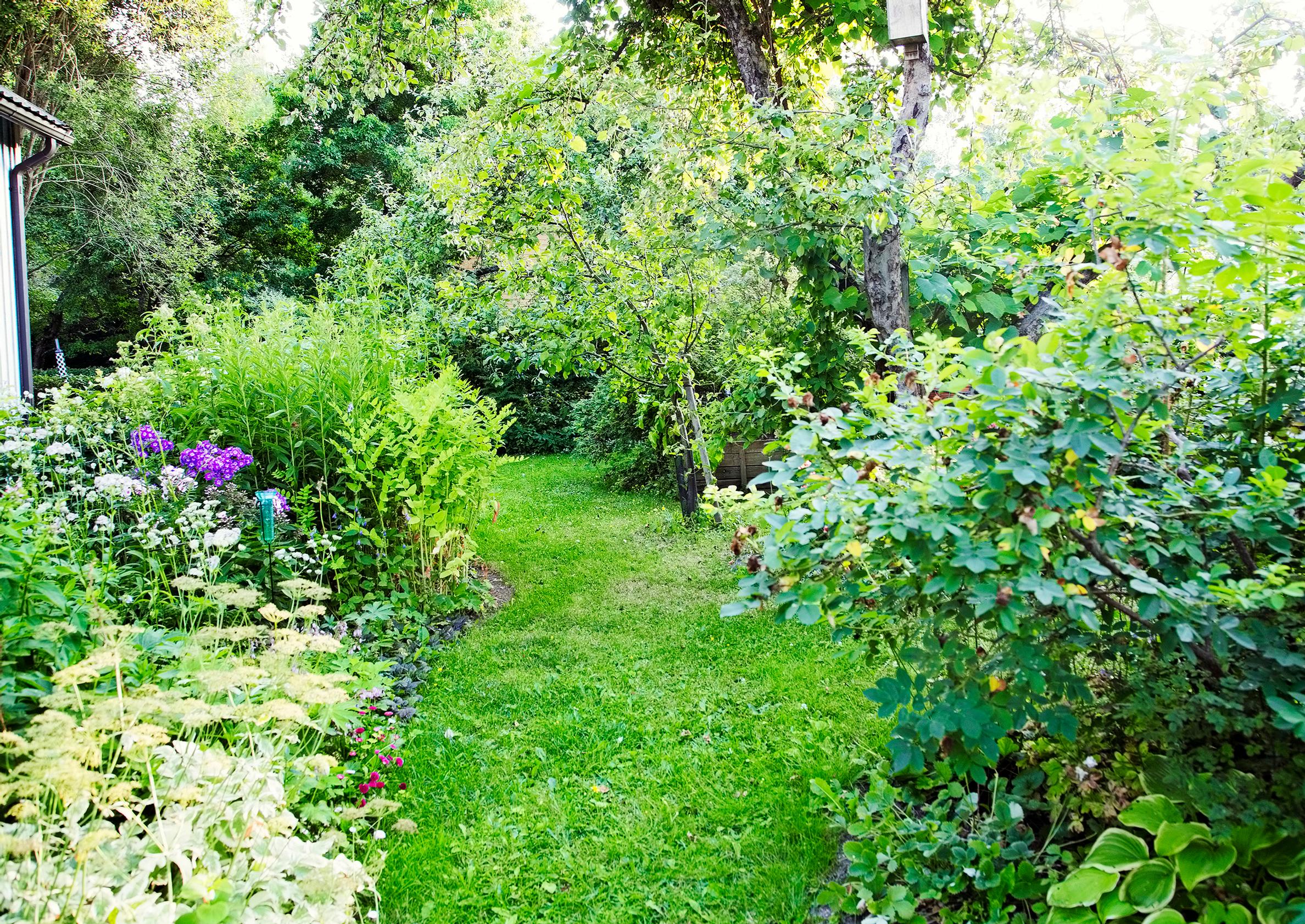 Suosin puutarhassani luonnonmukaisuutta ja kierrätystavaraa. Esimerkiksi vanhasta pihakeinun rungosta tuli kätevä köynnöstuki. Talvella siinä roikkuu lintulautoja, ja kesällä linnut hoitavat puutarhan tuholaistorjuntaa. En kitke pois rikkaruohoa, jos se näyttää minusta kauniilta. Itse asiassa olen kylvänyt tarkoituksella lisää piharatamoa, koska se kestää hyvin kolmen koiramme ravauksen.