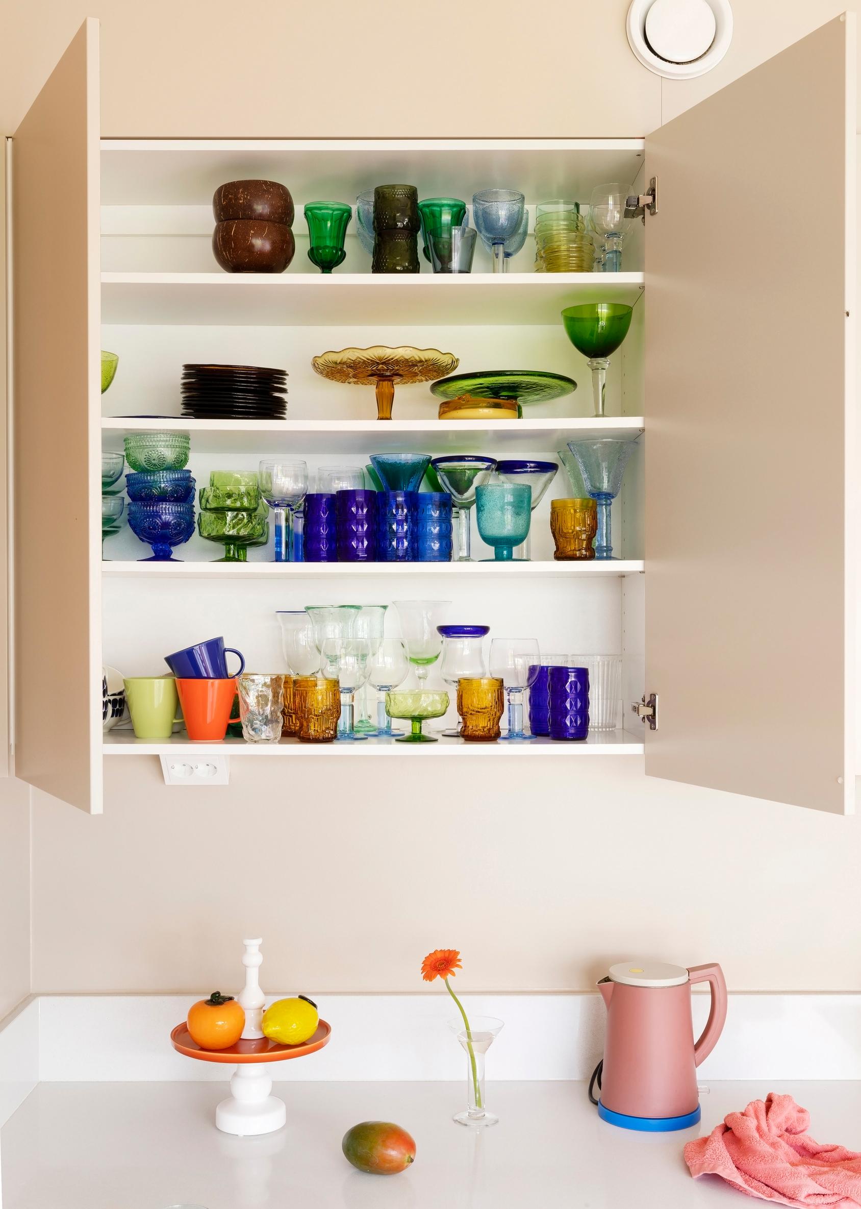 Tässä keittiössä voisi vaikka jättää yläkaappien ovet auki. Ajan kanssa karttunut värilasikokoelma on peräisin Kierrätyskeskuksista. Kaapissa on muun muassa Kerttu Nurmisen Mondo- laseja ja Arabian Koko-mukeja. Tasolla on Bosan jalallinen Issima-tarjoiluastia.