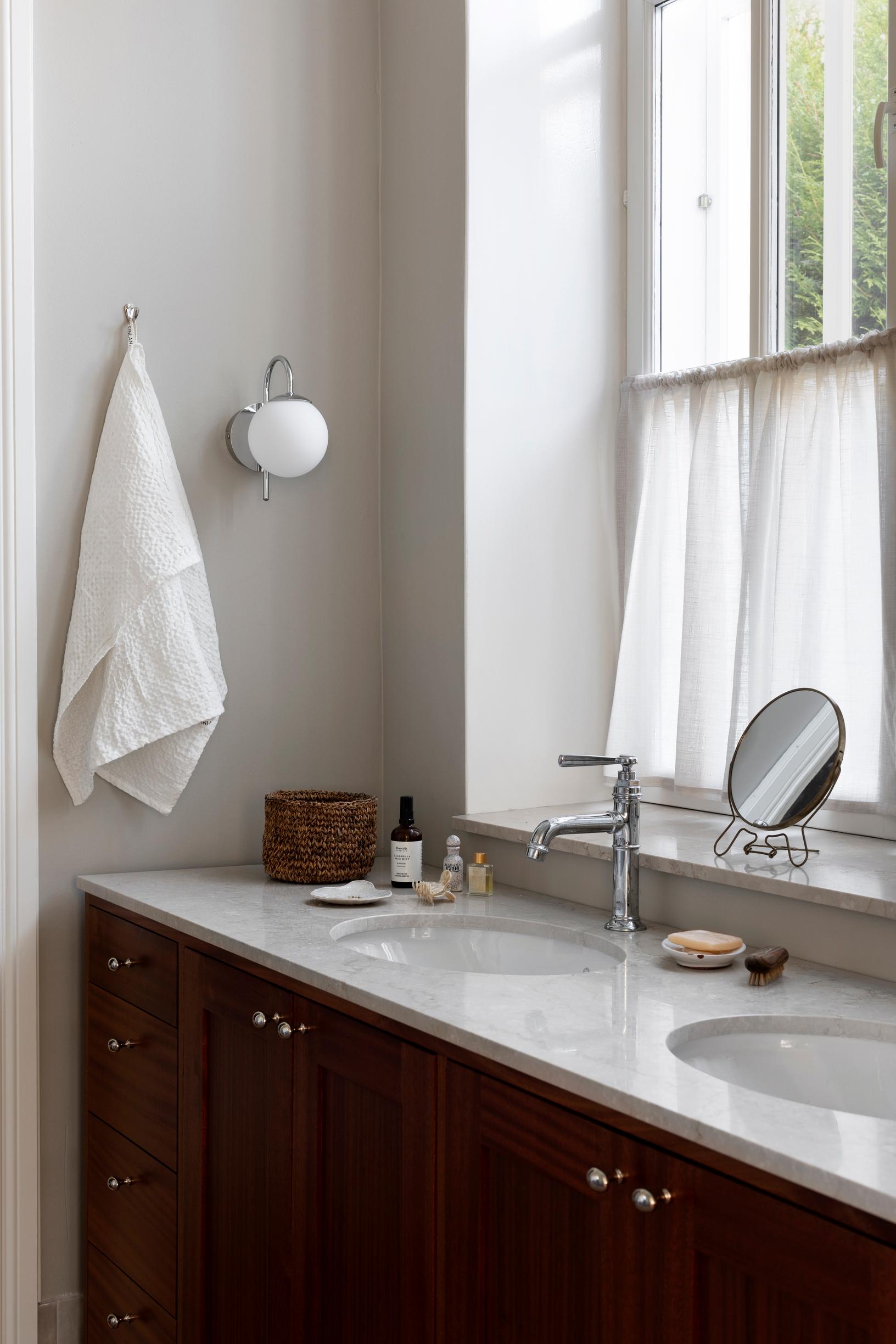 Peilin valo antaa mosaiikkiseinälle reliefimäisen ilmeen. Mosaico Porcelanico -laatat ovat Pukkilan. Kylpytilan syvennykseen sijoitetun keraamisen altaan reunoilla on sopivasti laskutilaa. Kivikuvioinen keraaminen allas on virolaisen Barbatuksen. Hana on Tapwellin EVO078 ja harjattua nikkeliä. Puuverhoiltu sivuseinä on käsitelty Osmo Colorin grafiitinsävyisellä öljypetsillä.