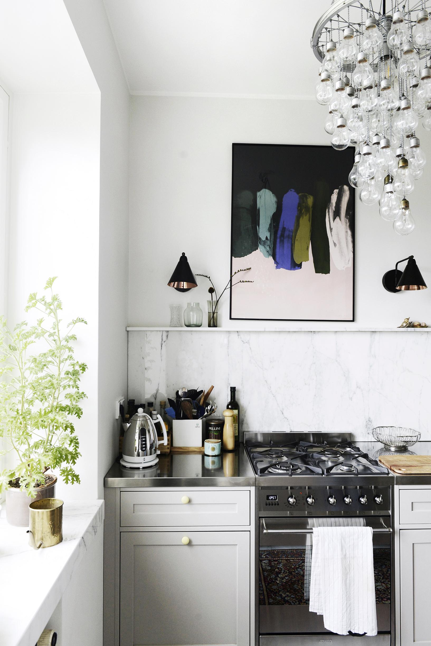 Vanhan kerrostalokettiön välitilassa on näyttävä marmorilevy ja samasta kivimateriaalista leikattu kapea hylly. Valoa heijasta marmorilevy sopii hyvin klassiseen keittiöön, jossa on peiliovet. Modernit seinävalaisimet ja maalaus tuovat ilmeikkyyttä valkoiseen keittiöön.