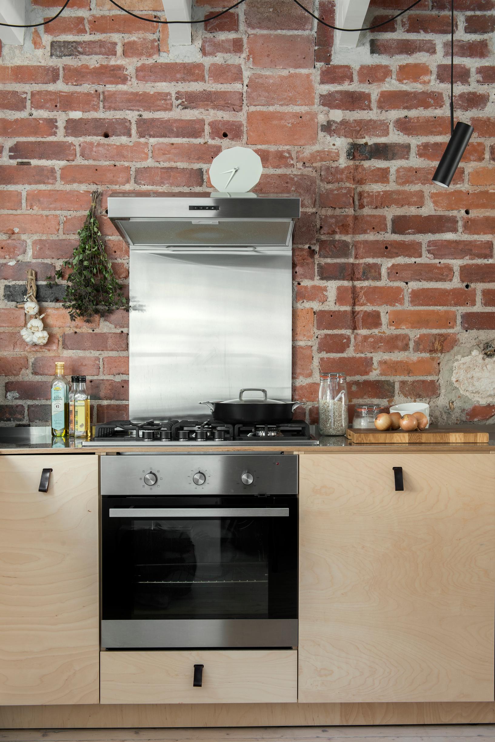 Alkuperäinen tiiliseinä on niin komea, että se jätettiin esiin asunnon remontin yhteydessä. Lieden taustana on käytännöllinen rosterilevy, josta on helpompi pyyhkiä rasvaroiskeet kuin rosoisesta tiiliseinästä. Kaapisto on teetetty mittatilaustyönä koivuvanerilevystä, joka on käsitelty Osmo Colorin puuvahalla.