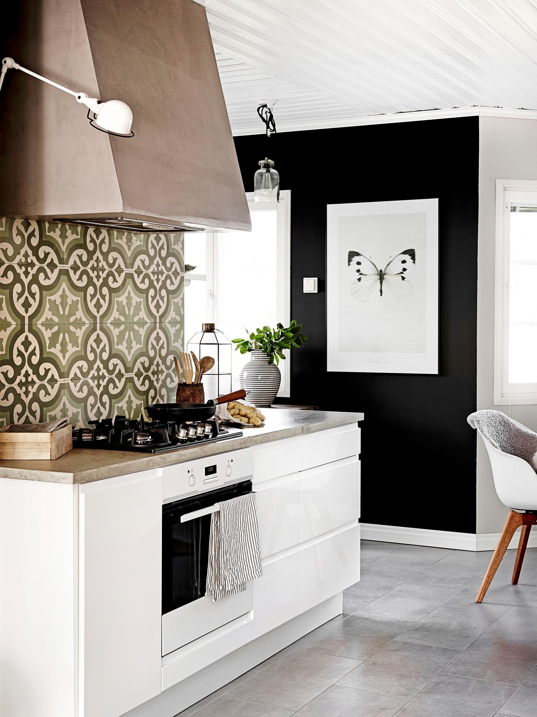 Omakotitalon keittiön kodikas tunnelma saatiin aikaan laatoittamalla lieden taustaseinä marokkolaisilla betonilaatoilla. Laattojen väreihin sopiva kookas liesikupu viimeistelee keittiön rustiikkihenkisen tyylin. Valkoisiin laatikostoihin on yhdistetty betonitaso.