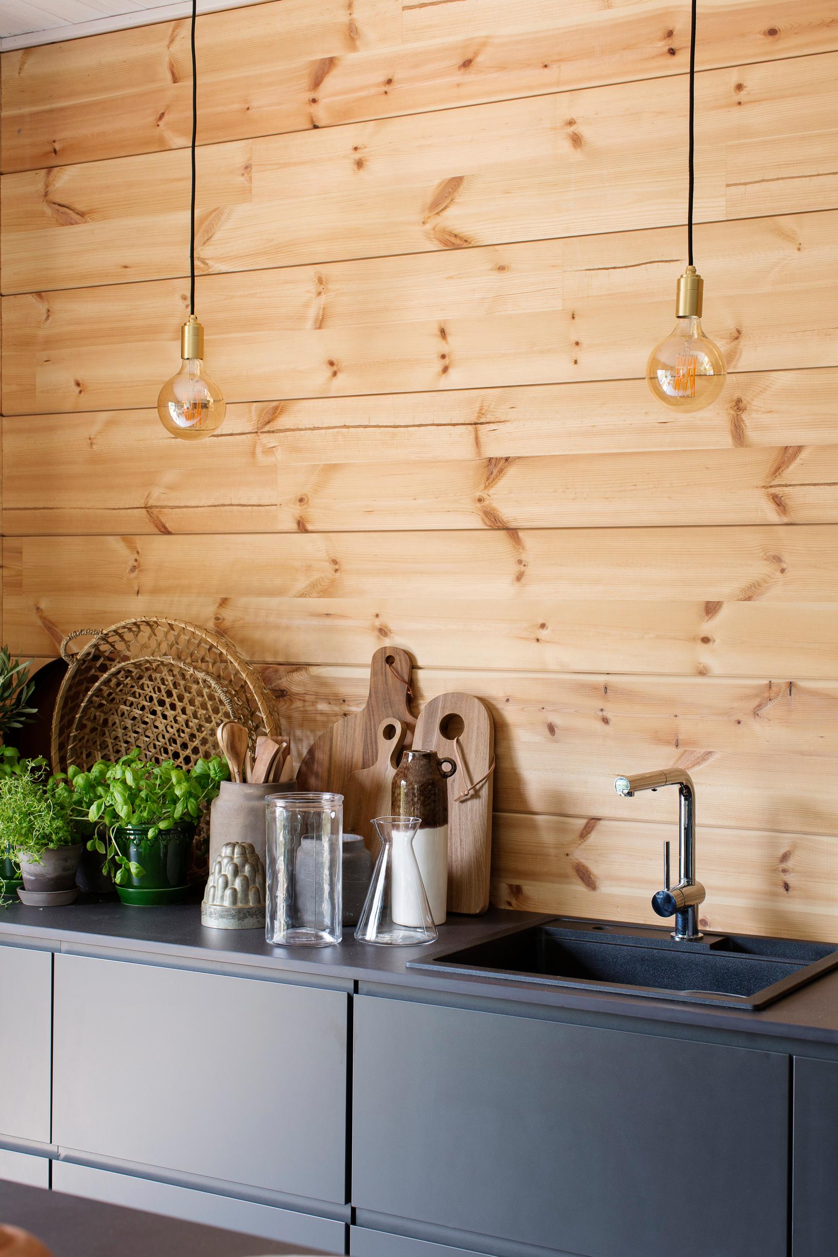 Komeaa hirsiseinää ei haluttu peittää yläkaapistoilla. Lämmin puu on kodikas kontrasti mustalle laatikostolle, jossa säilytetään lautaset, lasit ja kattilat. Jos haluat kodikkuutta kerrostalokeittiöön, paneloi työtason taustaseinä sisustuspaneelilla. Esimerkiksi Siparilan mallistossa on keittiöön sopivia vaihtoehtoja.