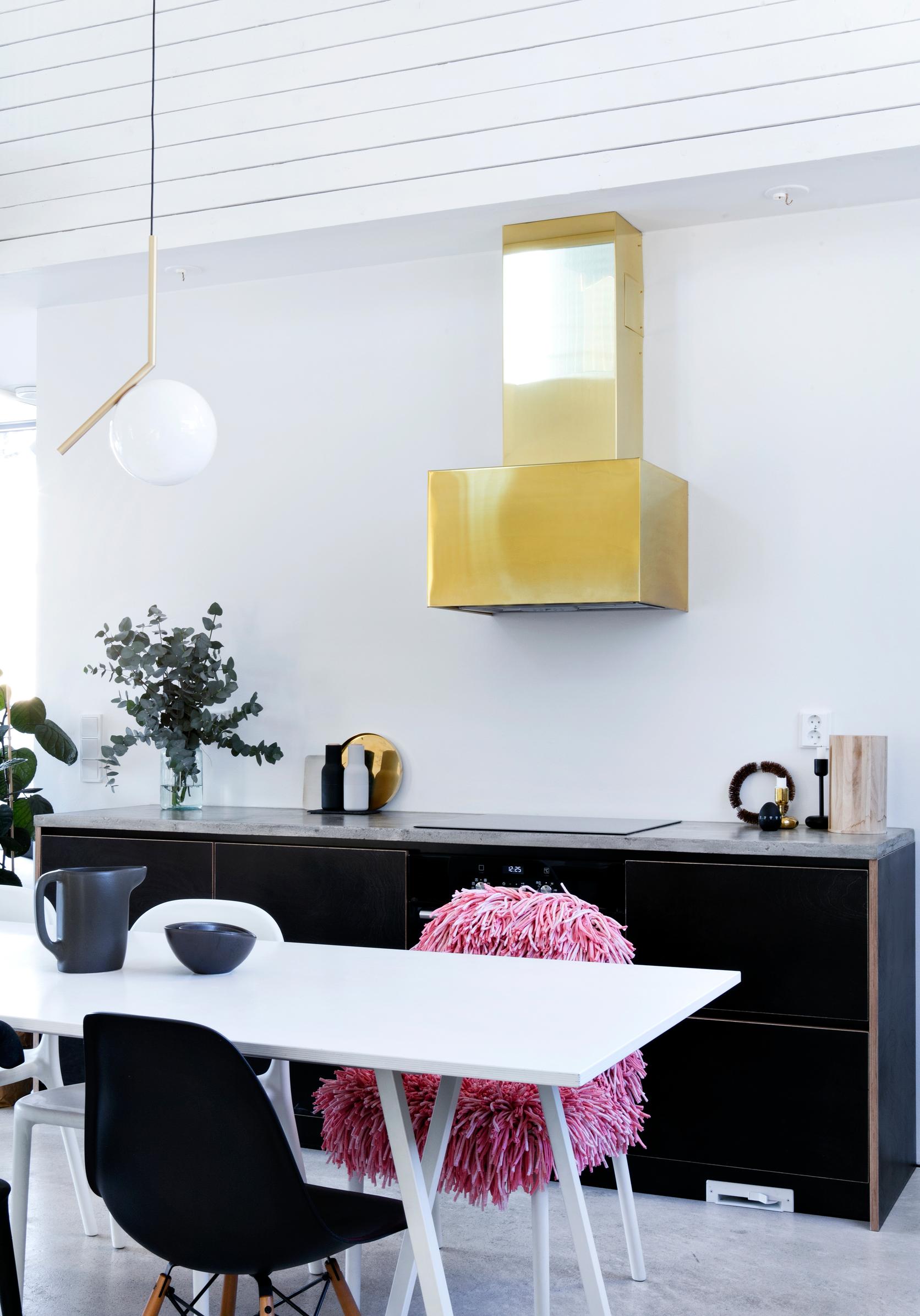 Modernin keittiön katseenvangitsija on mittatilaustyönä valmistettu messinkikotelo, jonka sisällä on liesituuletin. Harmaalla maalattu taustaseinä korostaa messingin lämmintä väriä ja hohdetta.