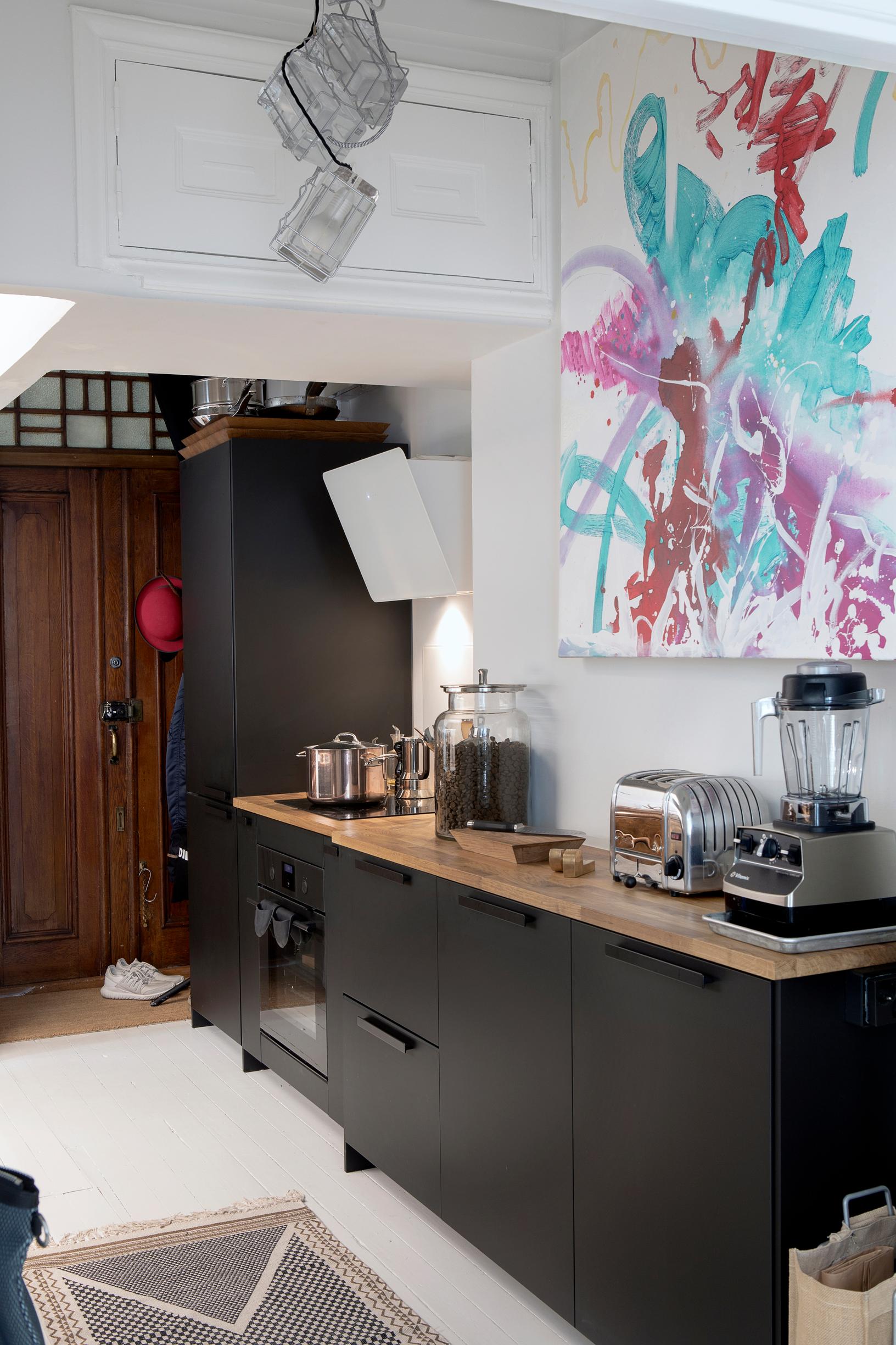 Jos haluat keittiöön väriä, mutta et halua maalata seiniä, sijoita seinälle värikäs maalaus tai valokuvasuurennos. Tämän keittiön maalaus on asetettu sopivan etäisyyden päähän liedestä ja liesituulettimesta niin, ettei liedeltä nouseva höyry ja roiskuva rasva pilaa sitä. Seinän maalipinta kestää kostealla pyyhkimistä.