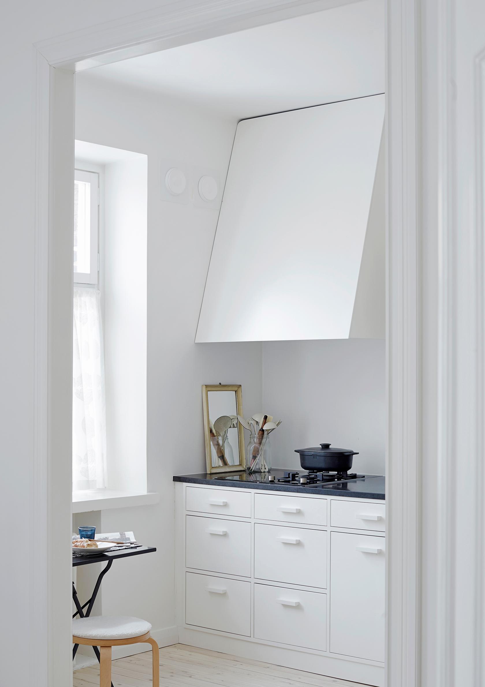 Vanhan kerrostalohuoneiston keittiössä on alkuperäiset 1950-luvun alakaapit, jotka on maalattu valkoisiksi. Uusi työtaso on graniittia. Minikeittiössä kokataan paljon, ja siksi kunnon liesituuletin on asukkaalle tärkeämpi kuin yläkaapit. Valkoinen huuva näyttää ilmavalta valkoista seinää vasten.