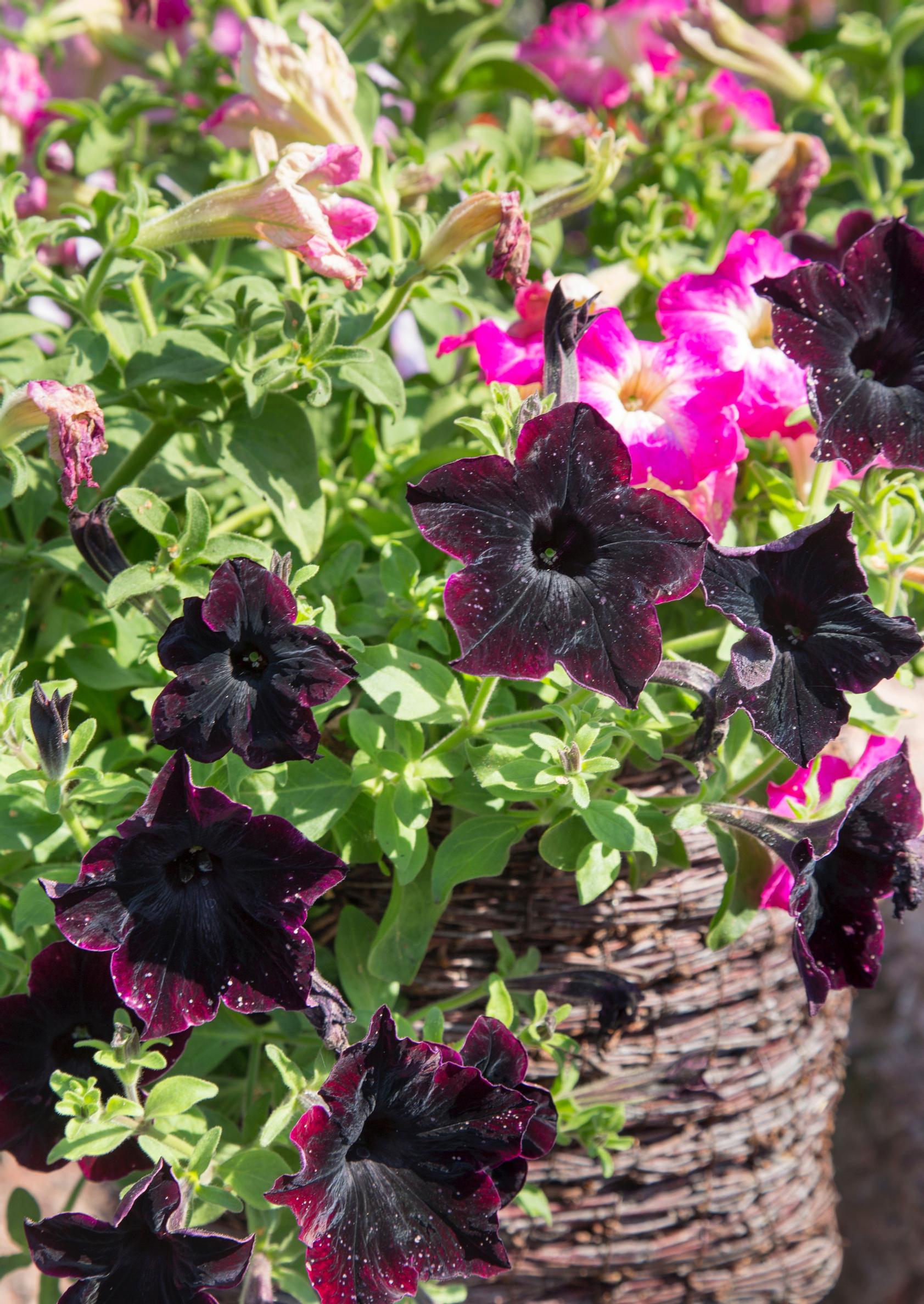 Petunioilla on näyttävät ja värikkäät kukat. Kuihtuneet kukat kannattaa poistaa säännöllisesti, jotta kukinta jatkuu läpi kesän. Kuvassa tumma 'Debonair Black Cherry'. Lue petunian hoito-ohje ja katso ideoita petuniaistutuksiin.
