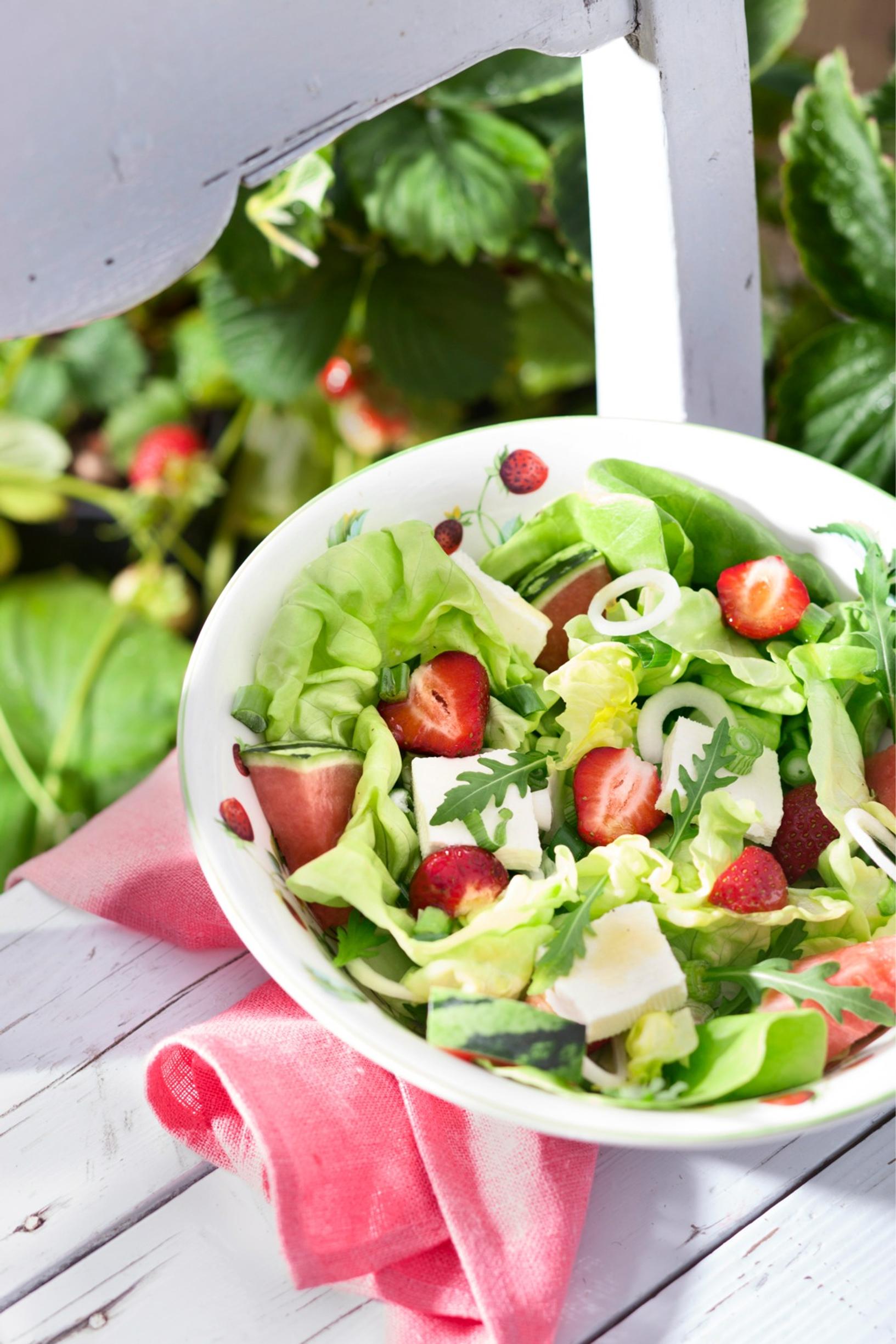 Mansikka-kotijuustosalaatti on miedomman juuston ystävän valinta. Ihana narskujuusto sopii täydellisesti salaattiin mansikoiden, vesimelonin ja kesäsipulin kanssa.