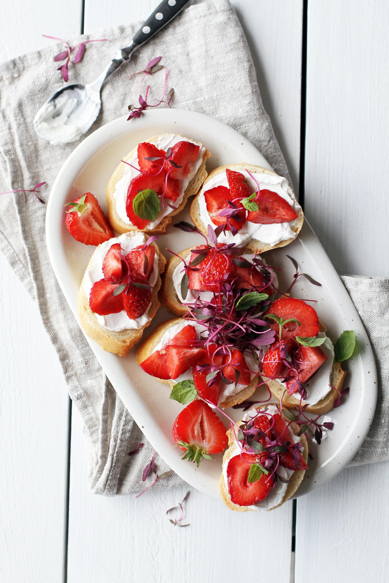 Mansikka-vuohenjuustocrostinit kasataan kätevästi kolmesta raaka-aineesta: patonkiviipaleiden pinnalle riittää sipaisu pehmeää vuohenjuustoa ja muutama mansikkaviipale. Koristele suolaisenmakeat suupalat halutessasi versoilla tai mintunlehdillä.