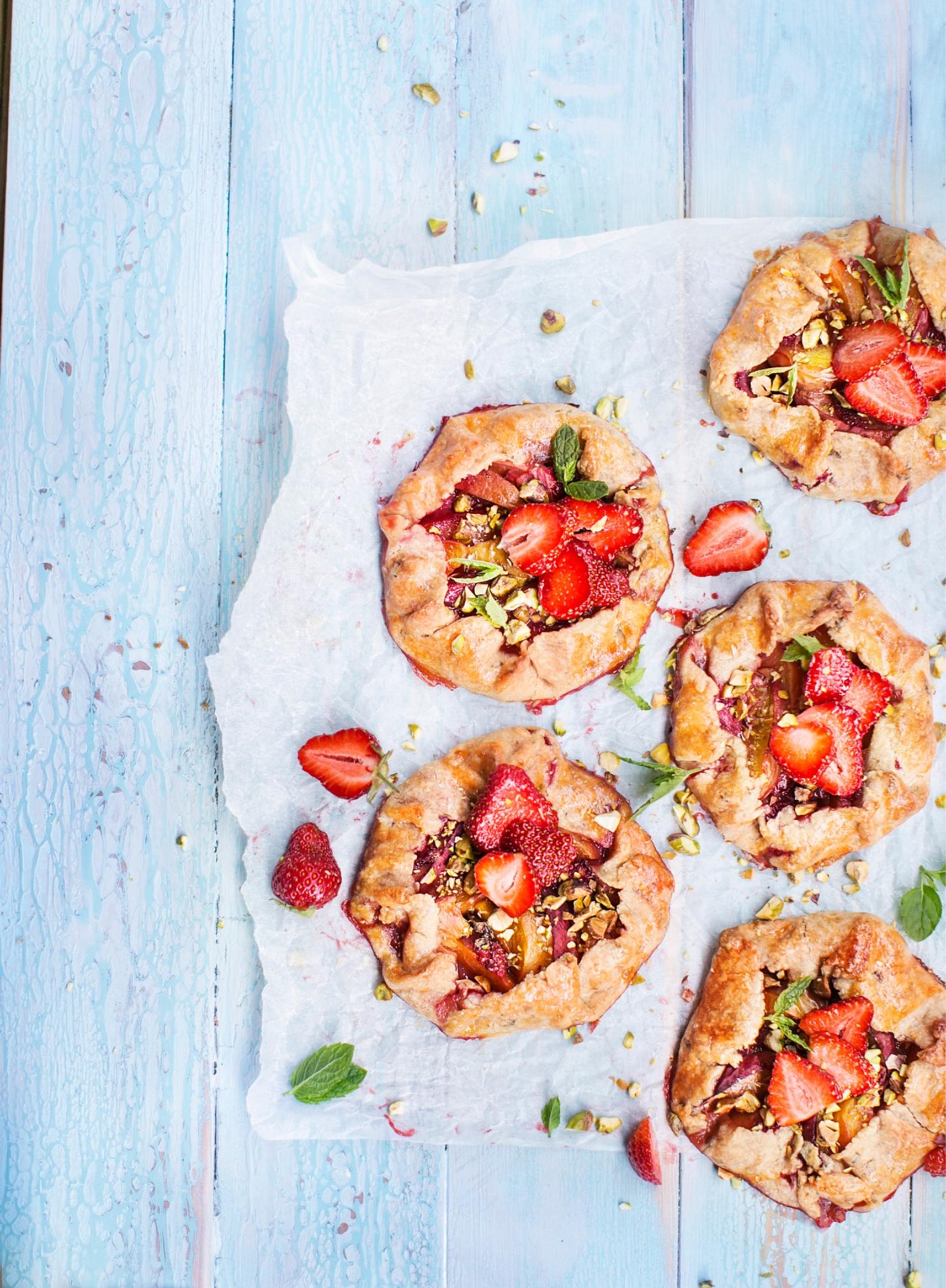 Mansikkagalette ihastuttaa rustiikkisella olemuksellaan. Mansikoiden lisäksi voit viipaloida pikkupiirakoiden täytteeseen nektariineja, persikoita tai arpikooseja. Psst! Pohjan salaisuus on fariinisokeri ja tuore minttu.
